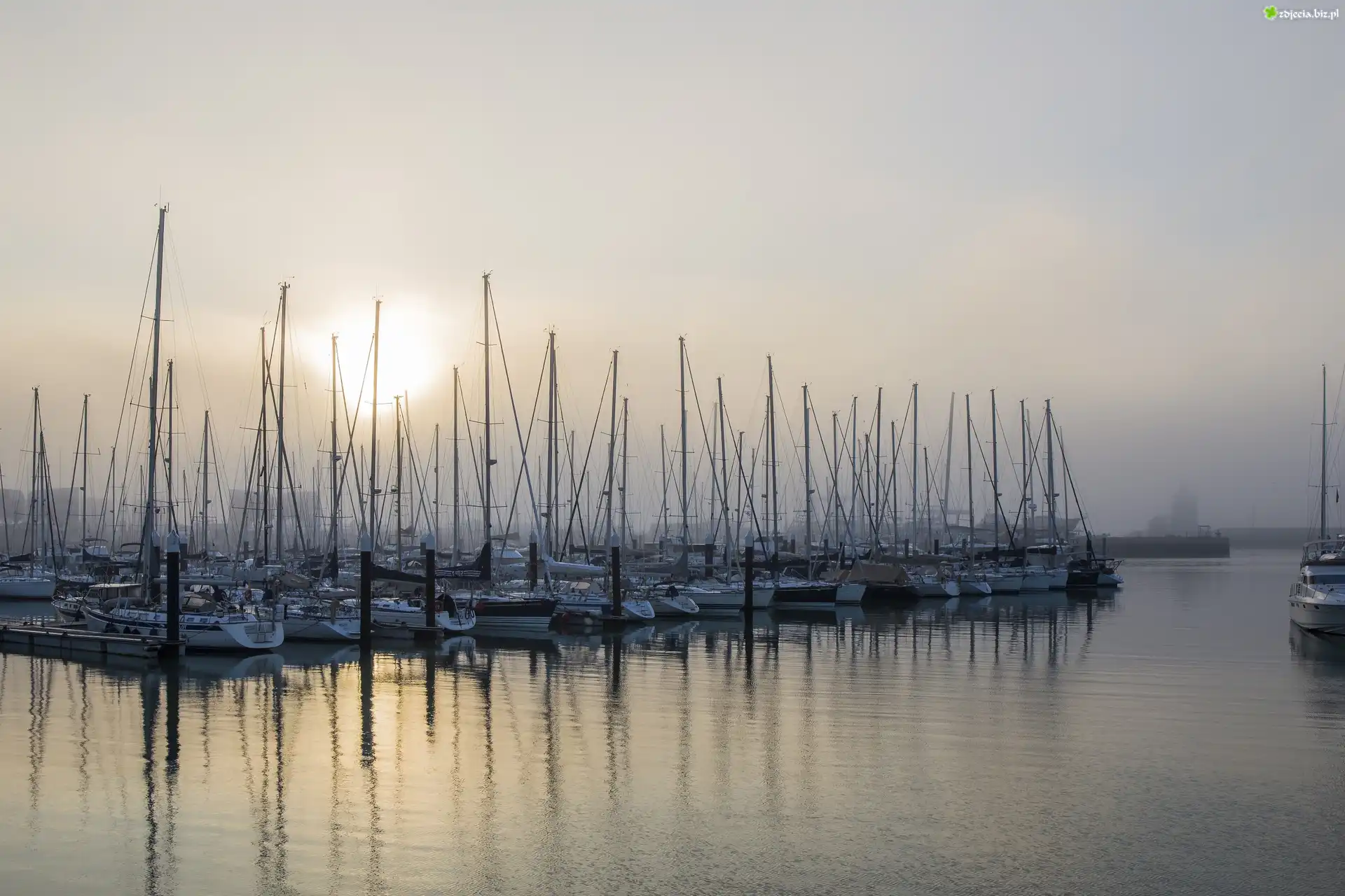 Zdjęcie, Żaglówki, Świt, Mgła, Wschód słońca
