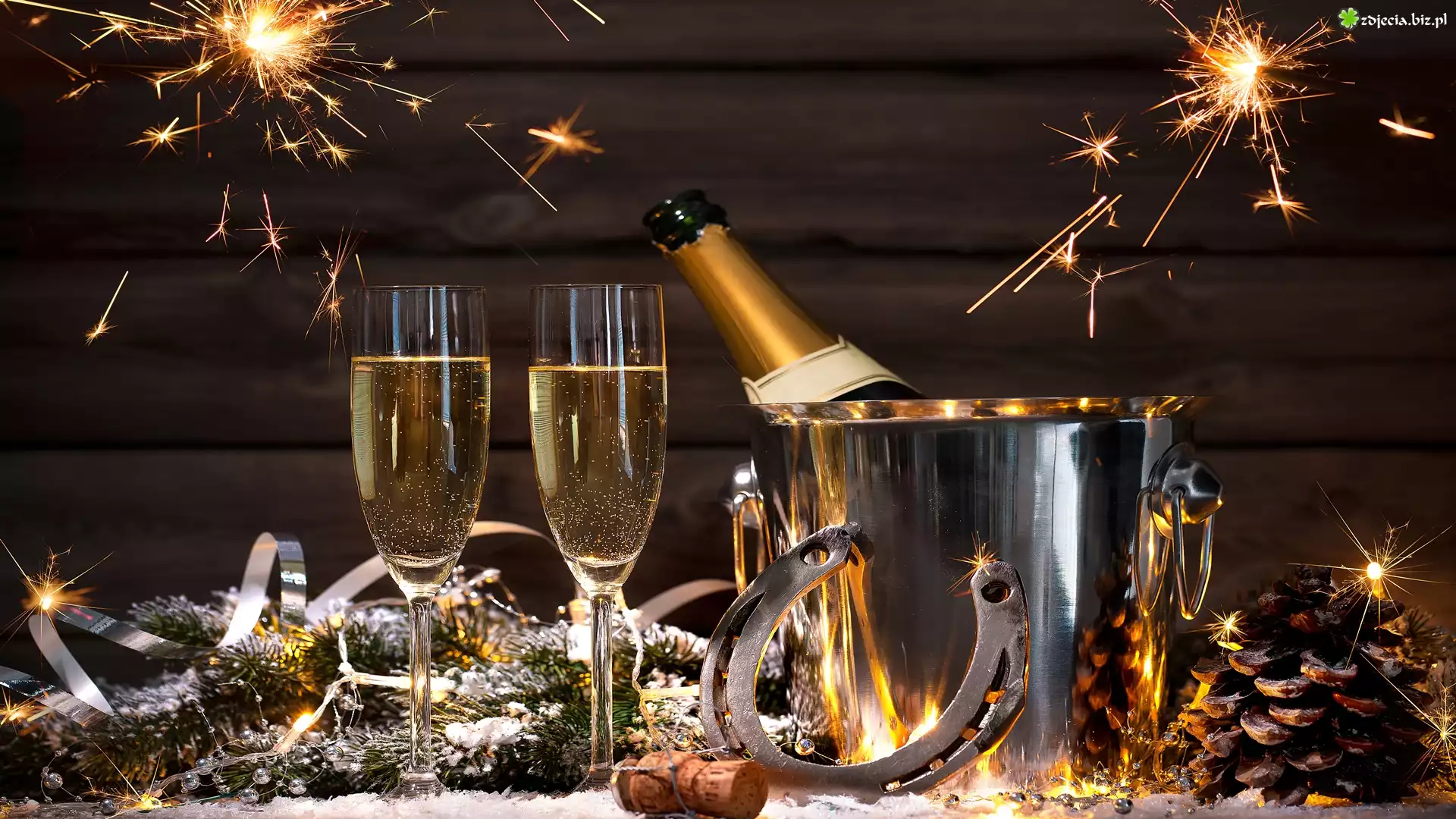 Zdjęcie Sylwester, Kieliszki, Szampan, Podkowa, Ozdoby