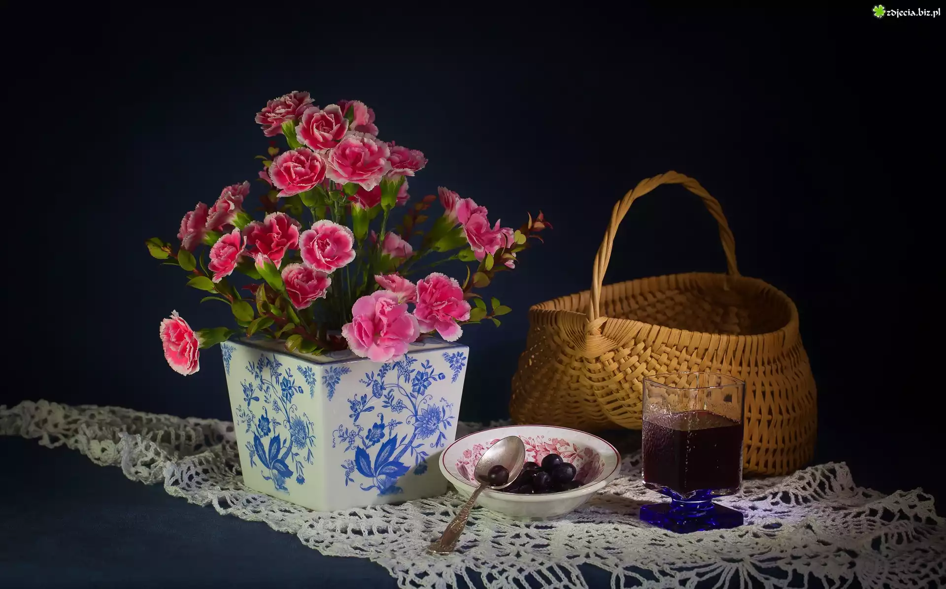 Zdjęcie, Goździki szabo, Doniczka, Koszyk, Miseczka, Jagody, Napój, Szklanka
