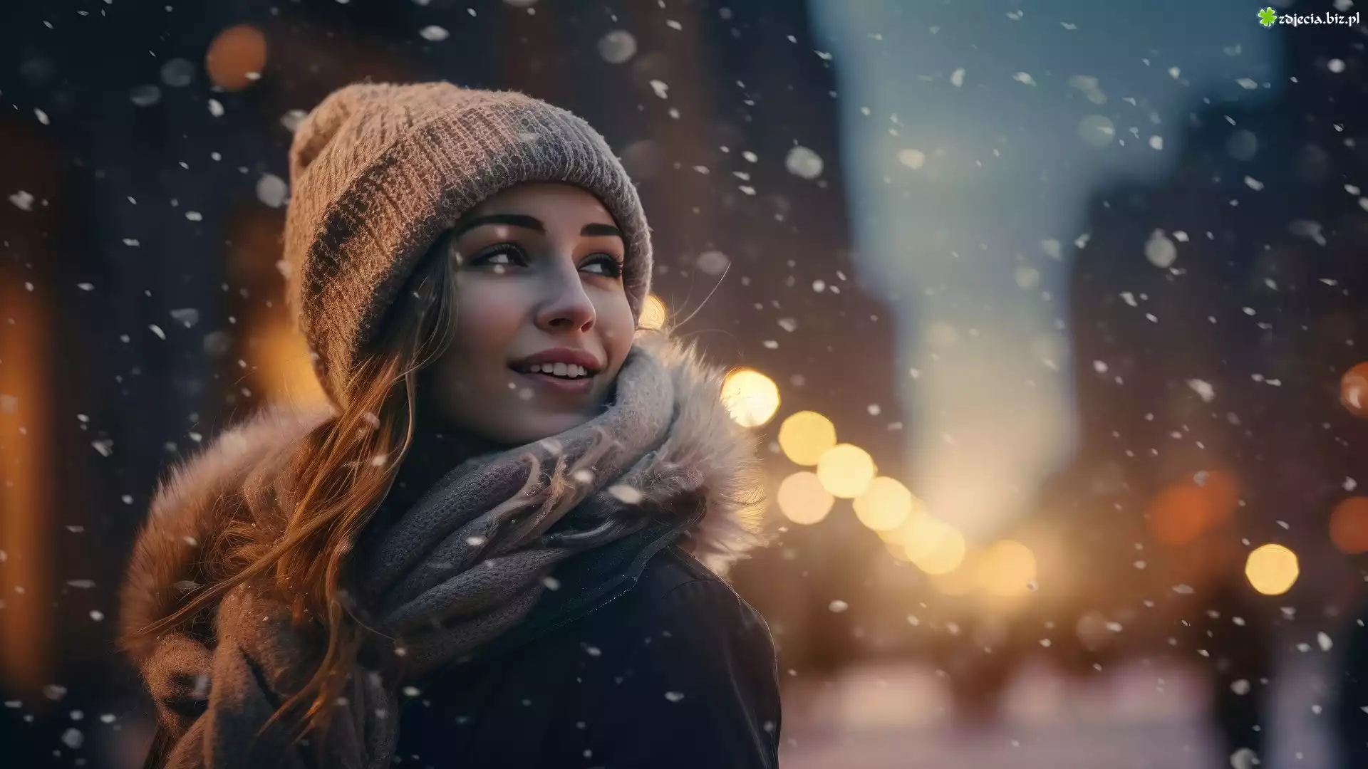Zdjęcie Zima, Kobieta, Czapka, Szal, Padający, Śnieg