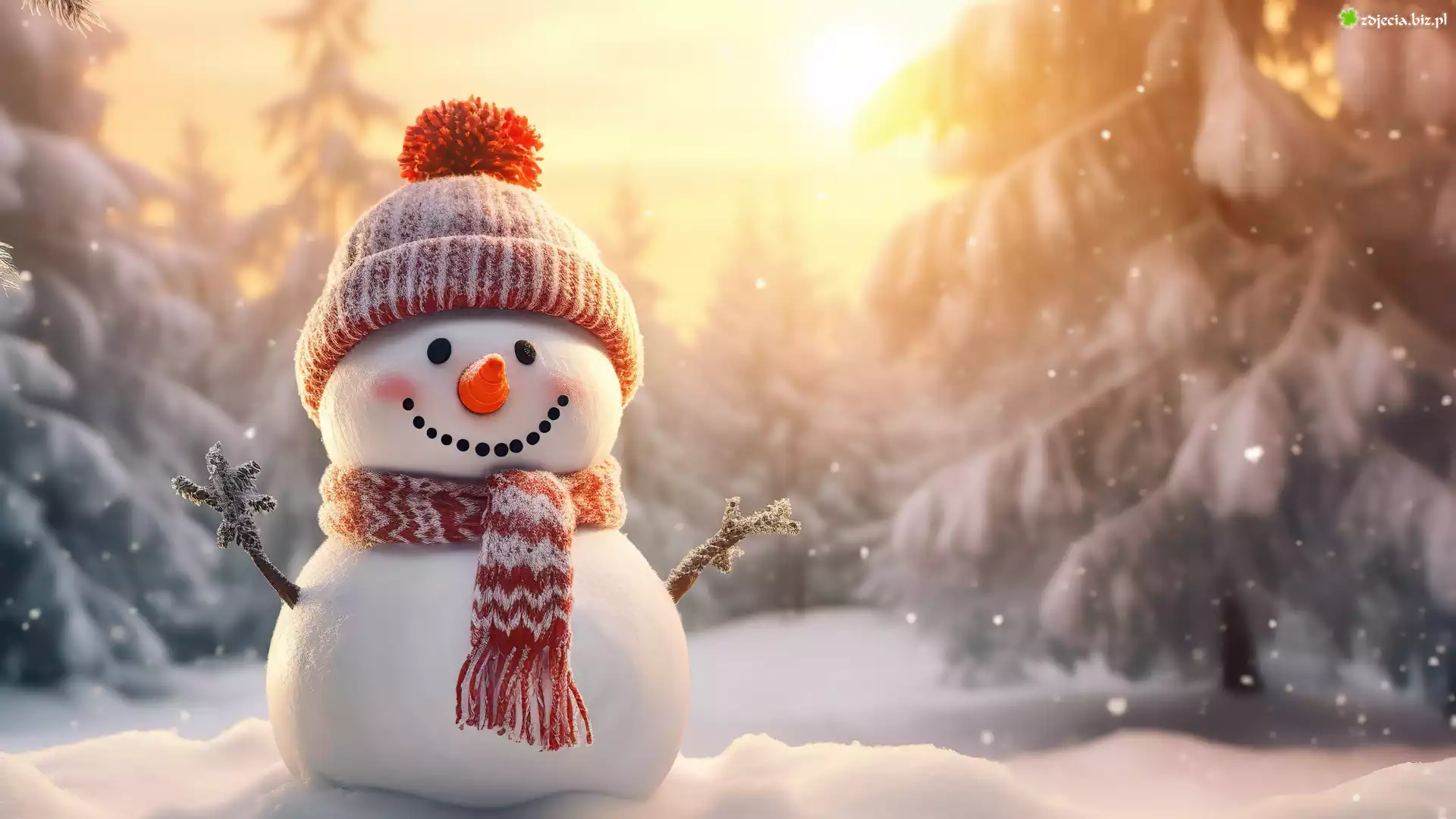 Zdjęcie Zima, Bałwan, Czapka, Szalik, Śnieg, Drzewa, Słońce