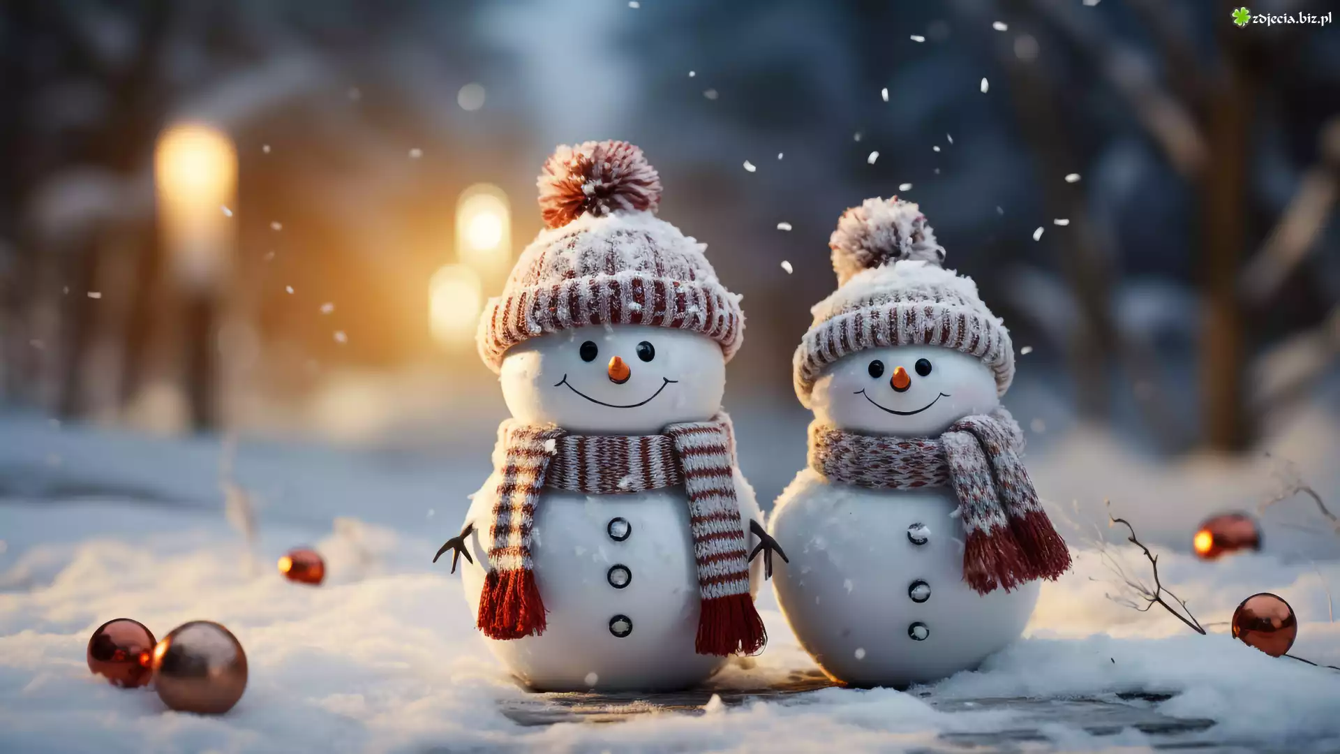 Zdjęcie Dwa, Bałwanki, Czapki, Szaliki, Śnieg, Bombki