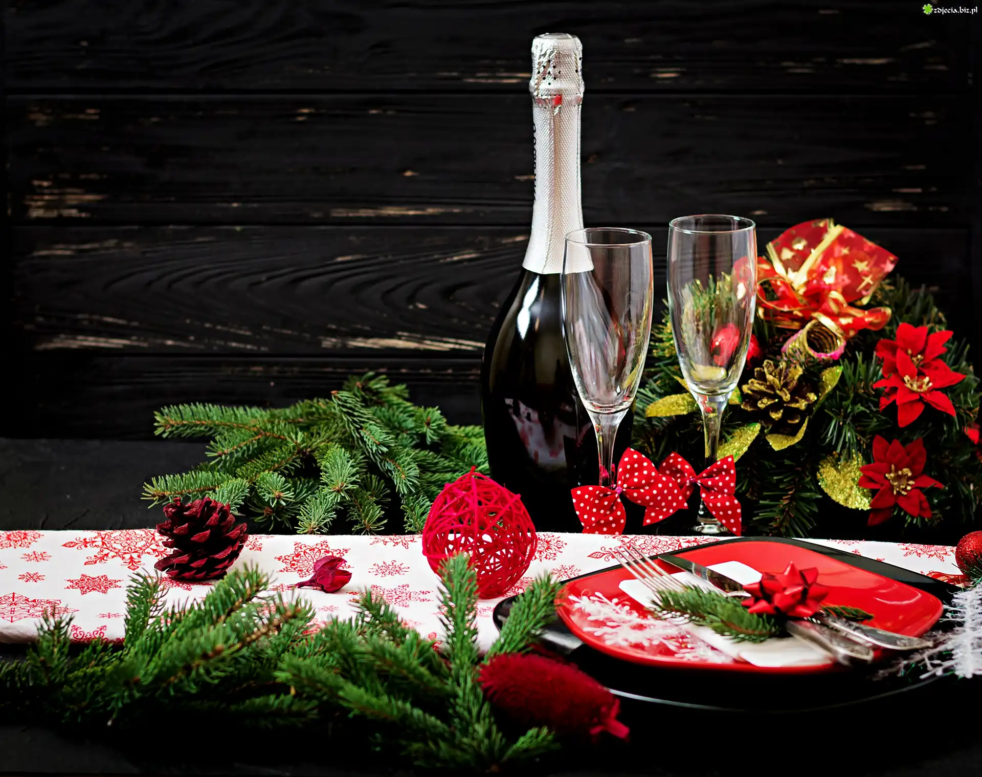 Zdjęcie, Szampan, Kieliszki, Talerze, Zielone, Gałązki