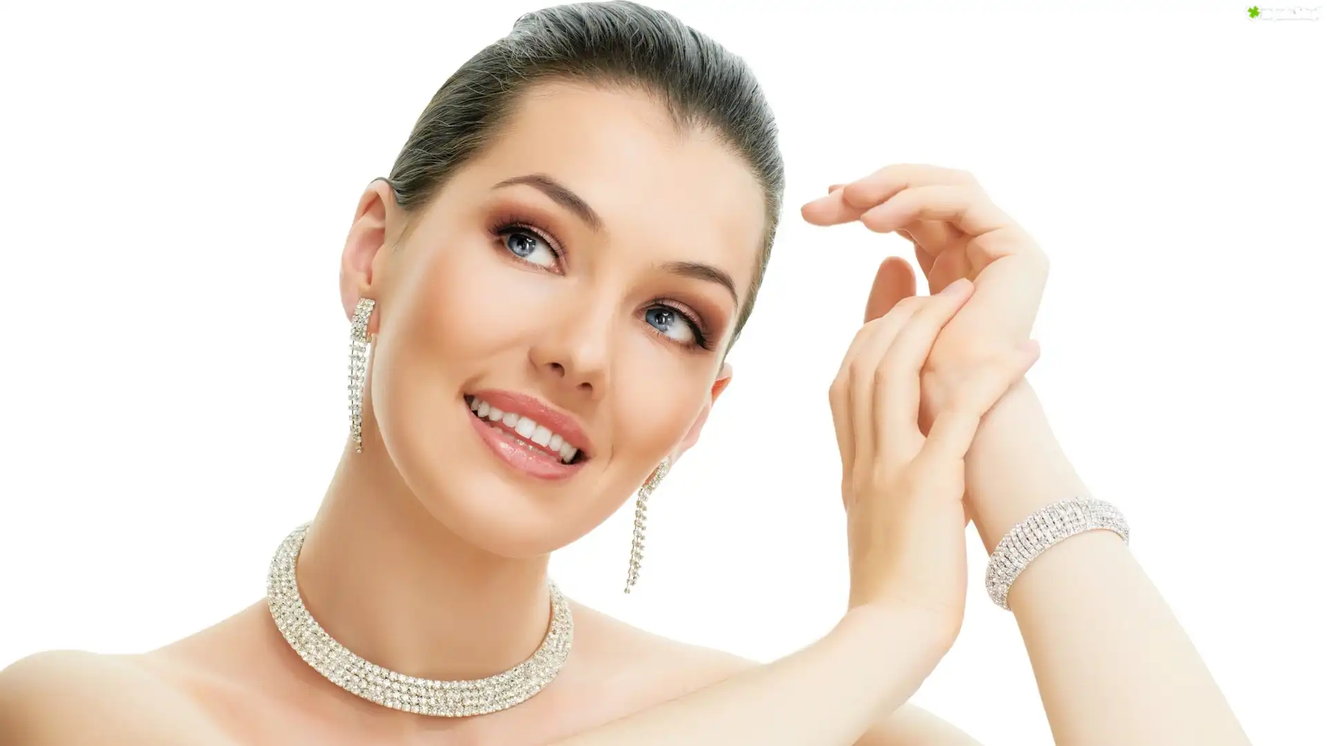 Zdjęcie Kobieta, Szatynka, Kok, Biżuteria, Naszyjnik, Kolczyki, Bransoletka