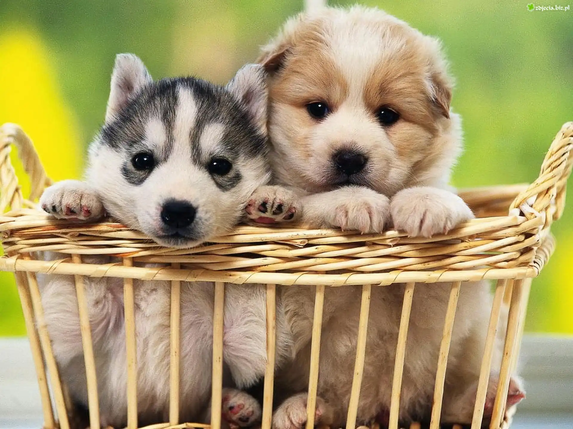 Zdjęcie Dwa, Szczeniaczki, Koszyk, Siberian Husky
