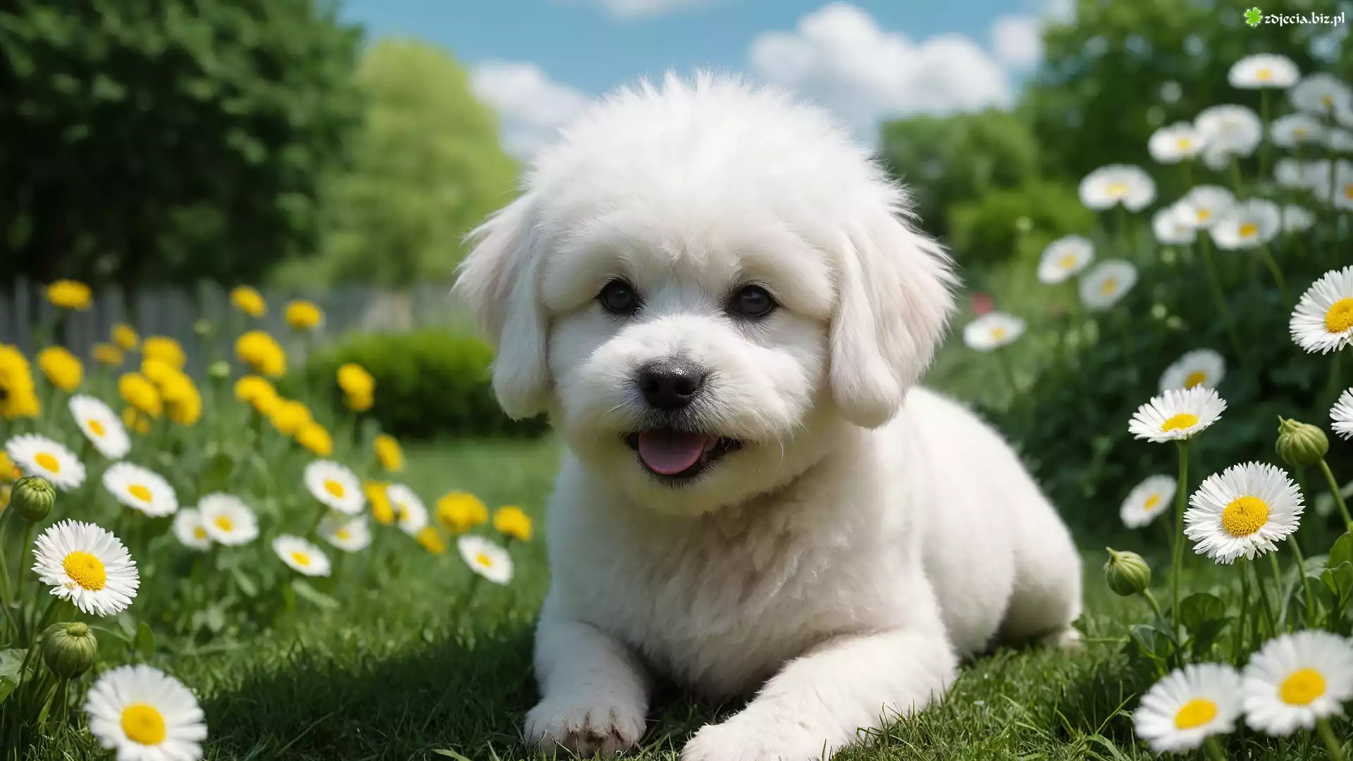 Zdjęcie Pies, Szczeniak, Biały, Kwiaty, Łąka