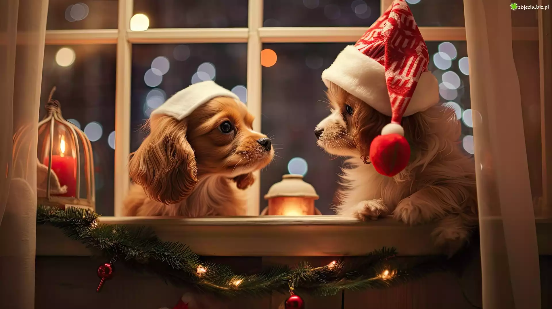 Zdjęcie, Psy, Szczeniaki, Czapki, Okno, Świeca