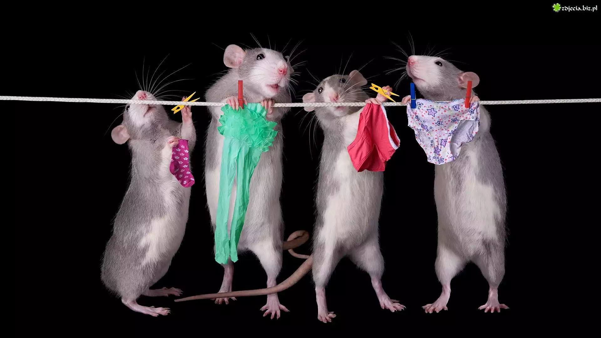 Zdjęcie Szczury, Sznurek, Klamerki, Pranie, Ciemne tło