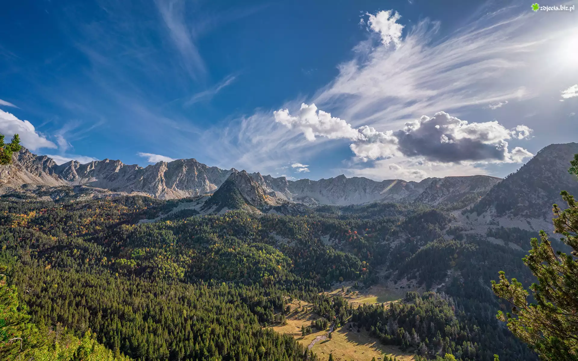 Zdjęcie Szczyty, Góry, Lasy, Drzewa, Chmury