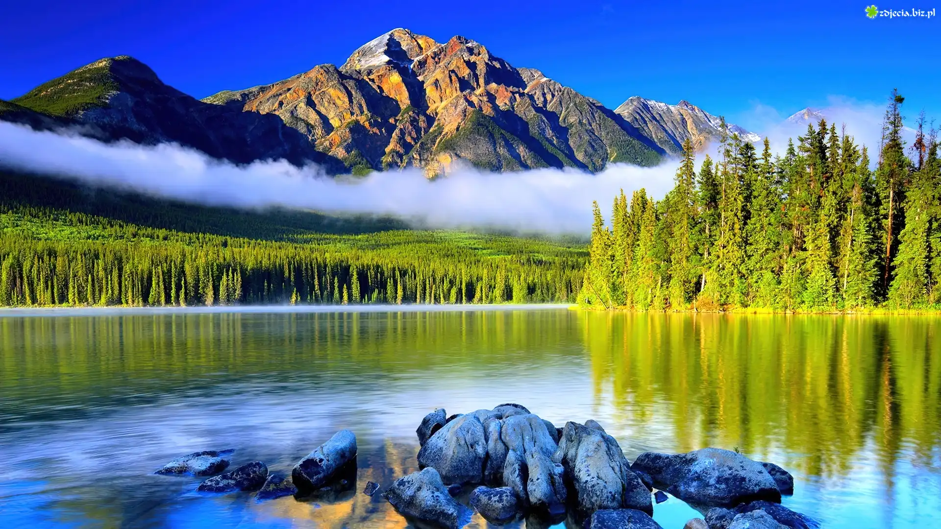 Zdjęcie Szczyty, Jezioro, Kamienie, Choinki