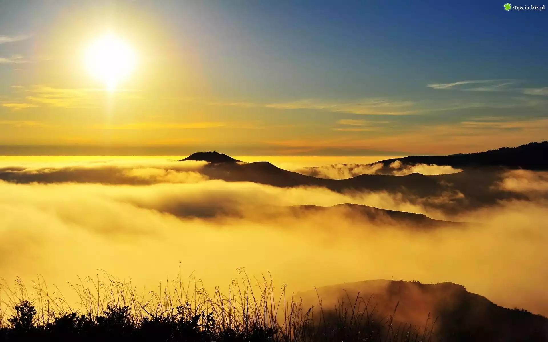 Zdjęcie Szczyty, Gór, Mgła, Słońce, Poranek
