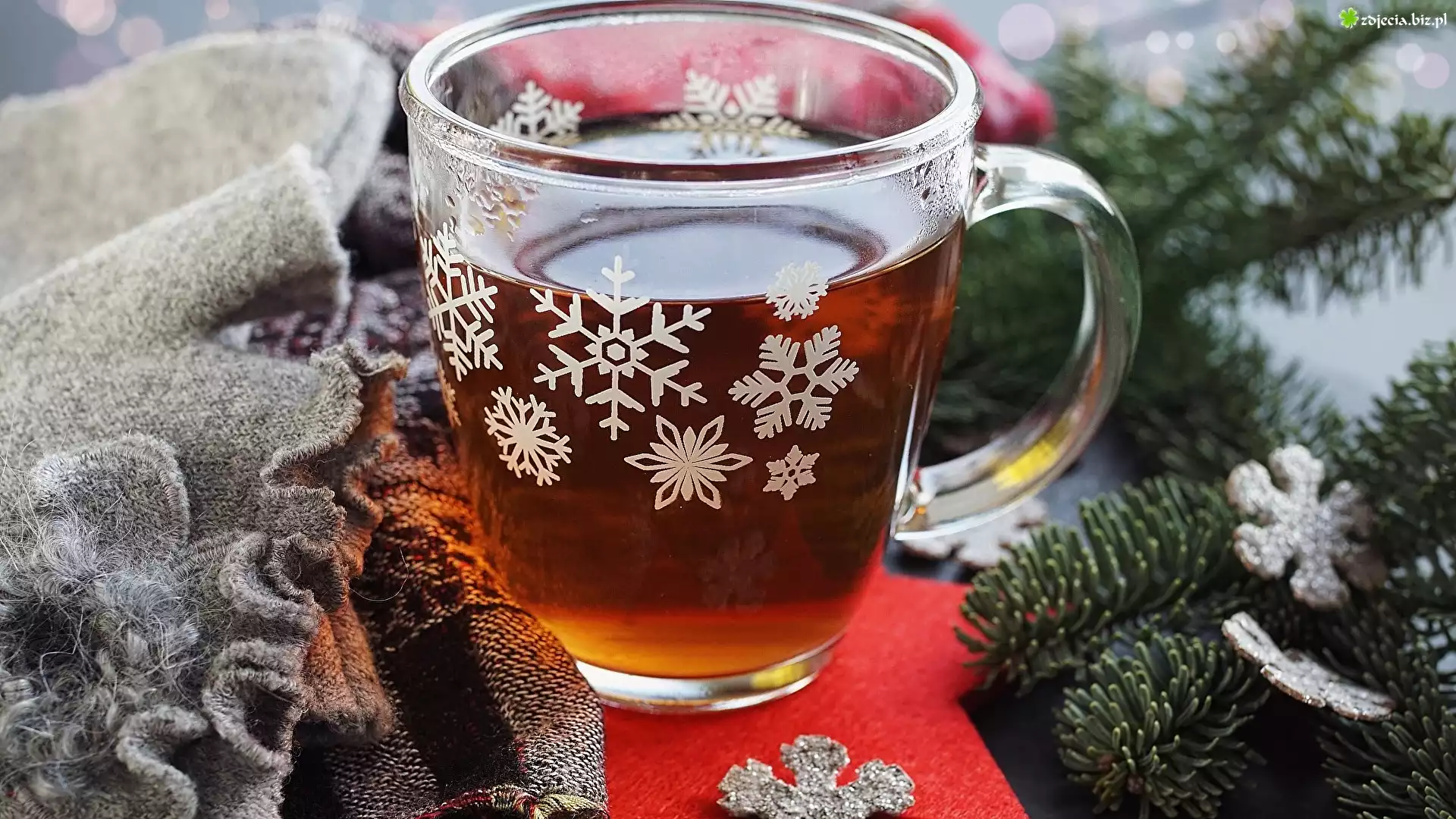 Zdjęcie Herbata, Szklany, Kubek, Śnieżynki, Gałązki, Szalik, Świąteczne