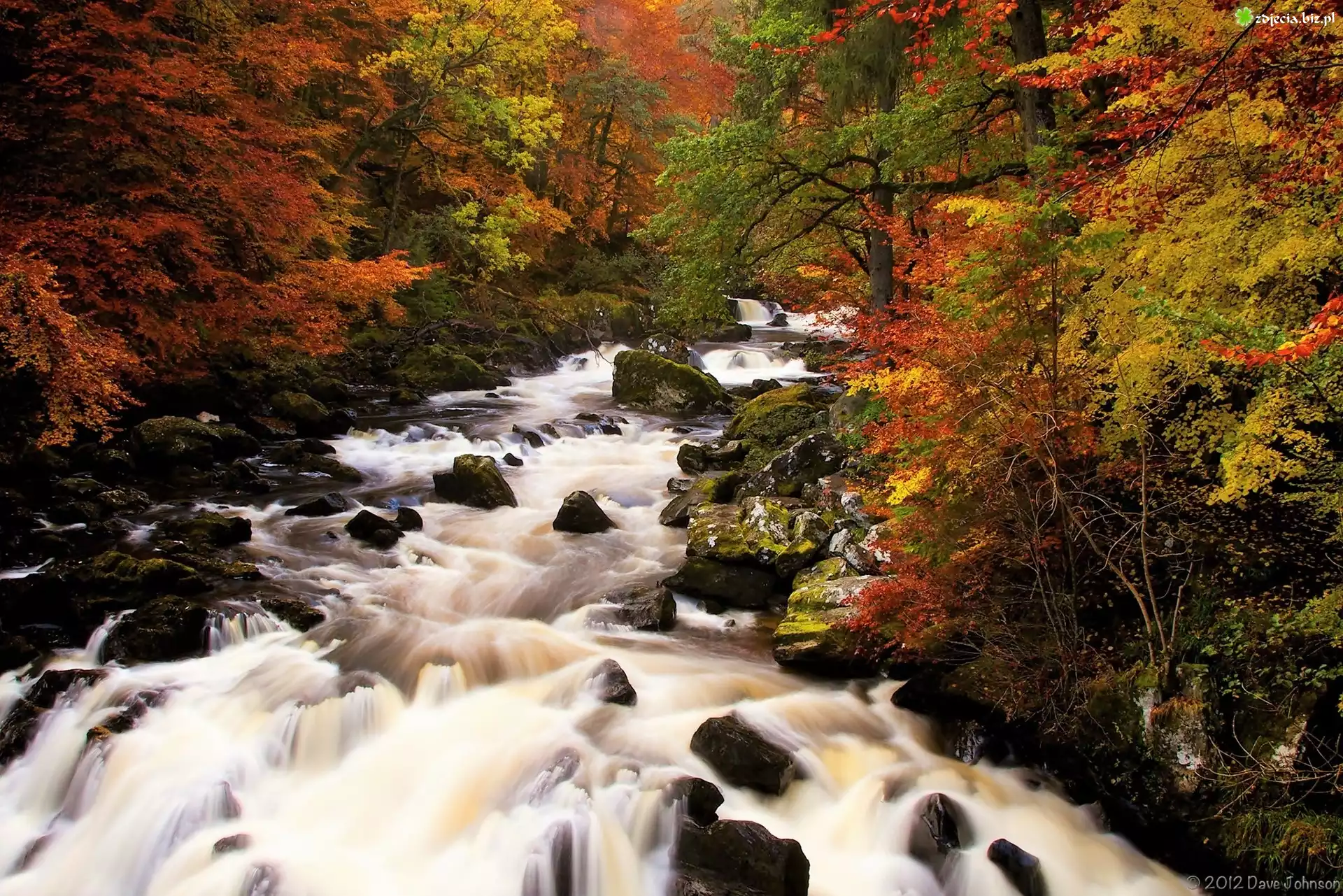 Zdjęcie Szkocja, Hrabstwo Perthshire, Las Craigvinean, Las państwowy Hermitage, Rzeka Braan, Kamienie, Las, Jesień |