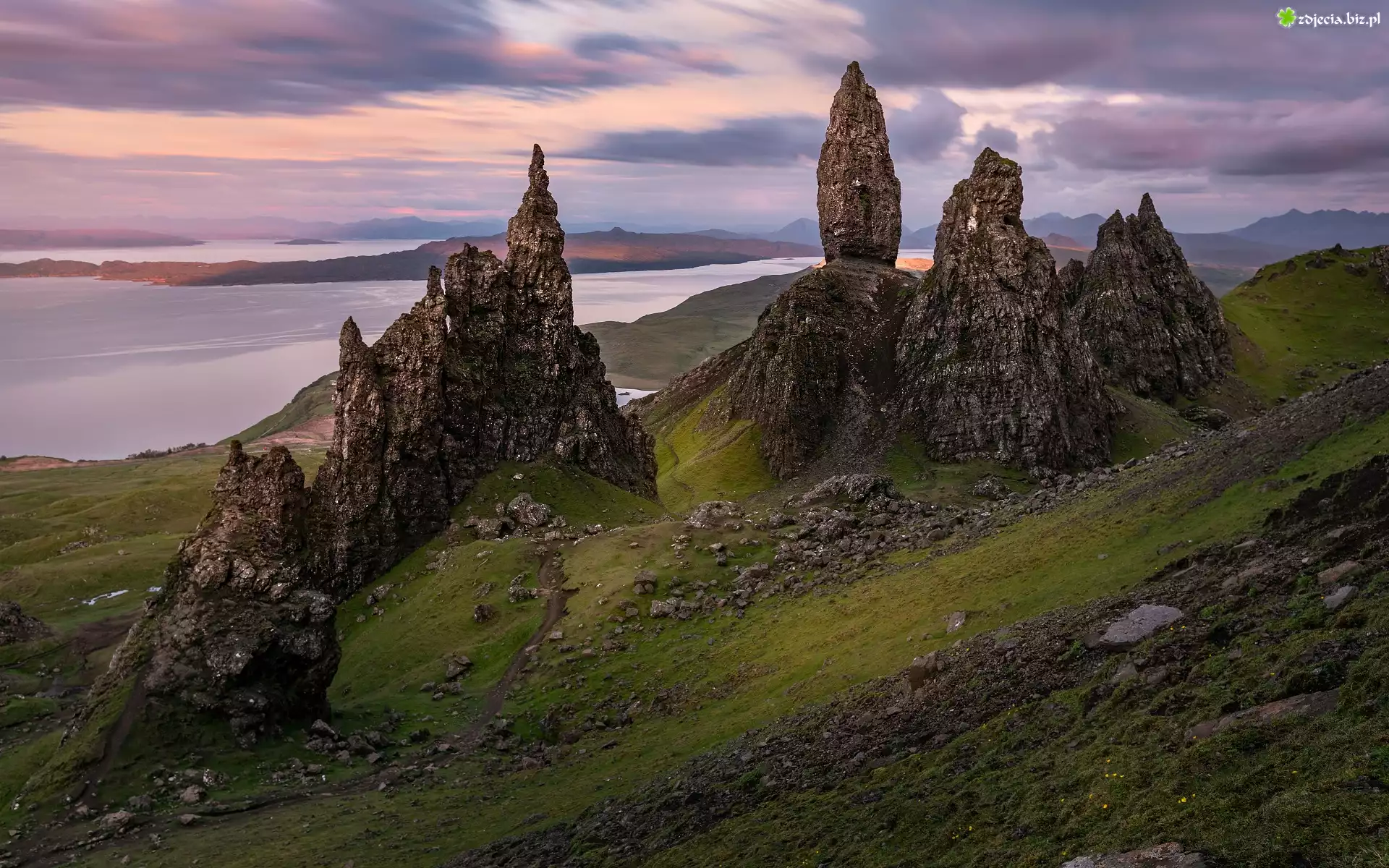Zdjęcie Szkocja, Wyspa Skye, Półwysep Trotternish, Wzgórze The Storr, Skały, Morze, Ścieżka, Zachód słońca |