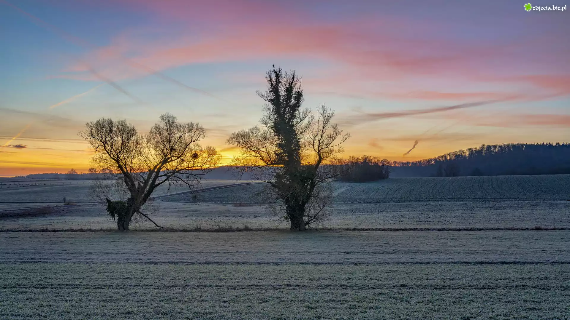 Zdjęcie Drzewa, Wierzby, Pole, Szron, Wschód słońca