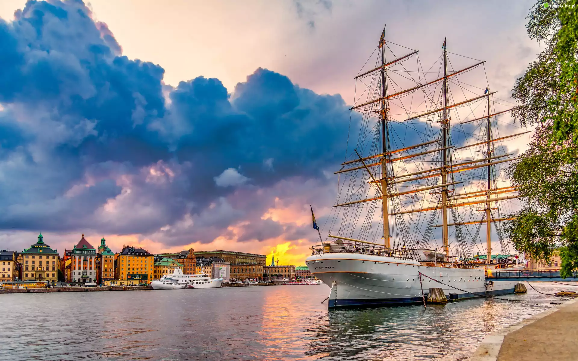 Zdjęcie, Szwecja, Sztokholm, Zatoka Saltsjon, Domy, Żaglowiec, Chmury