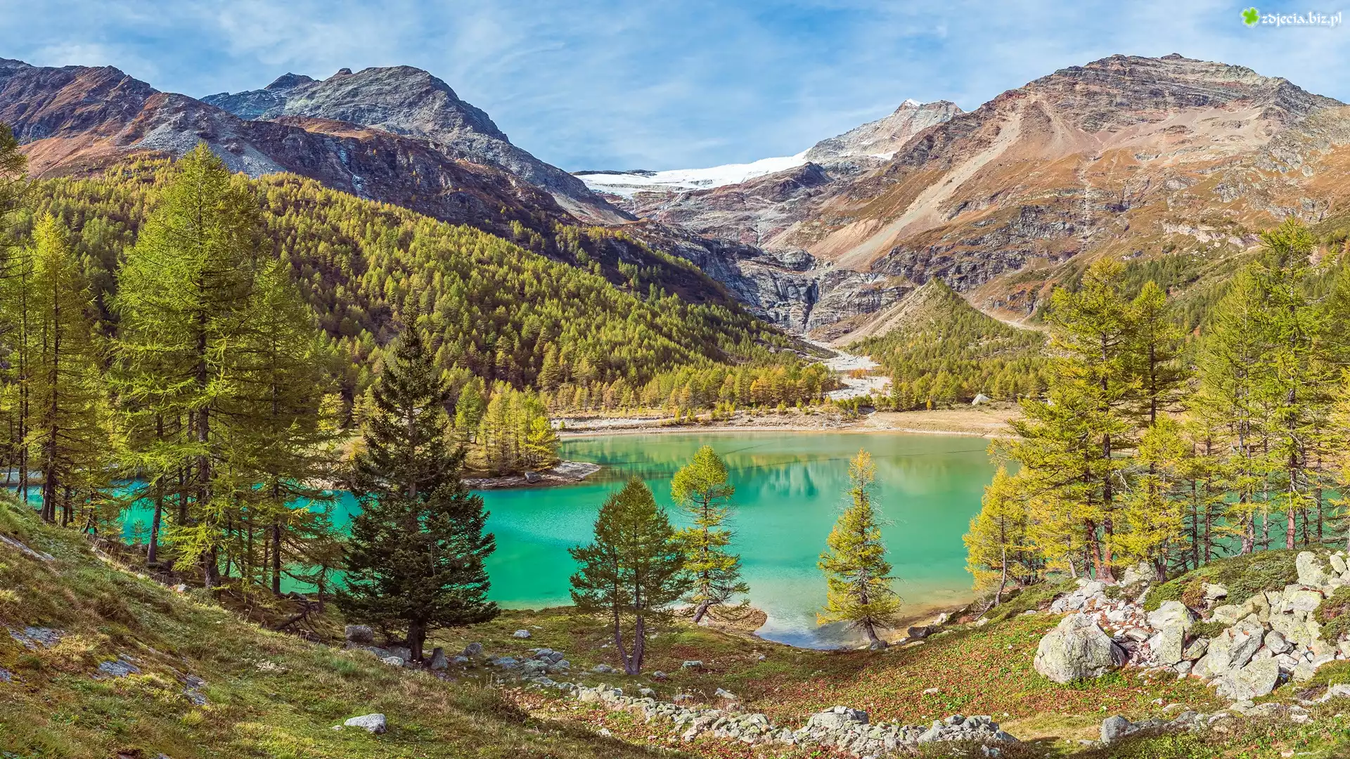 Zdjęcie Góry, Las, Drzewa, Jezioro, Palu Lake, Kamienie, Szwajcaria