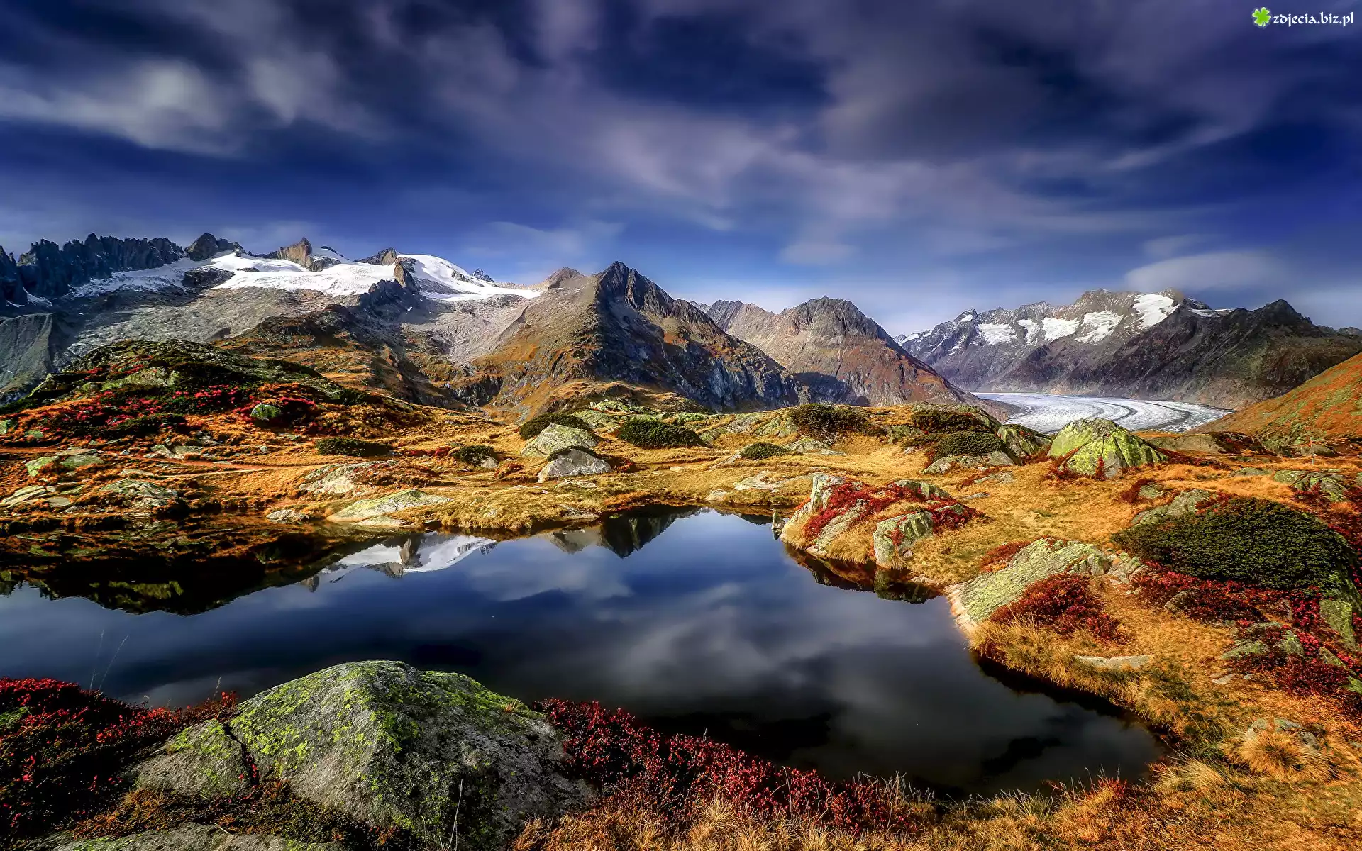 Zdjęcie Szwajcaria, Góry, Alpy Berneńskie, Lodowiec, Aletschgletscher, Jezioro Marjelensee, Niebo, Chmury |