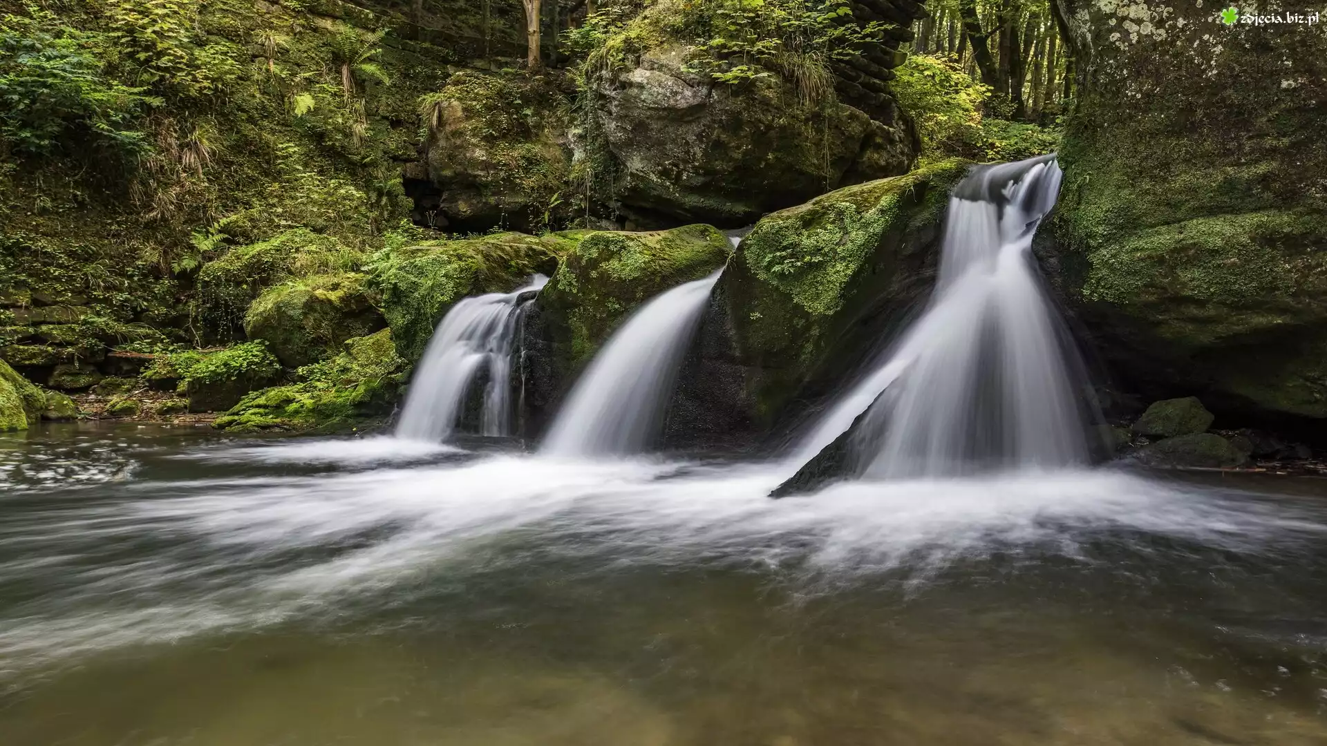 Zdjęcie Wodospad Schiessentumpel, Rzeka, Most, Omszone, Skały, Las, Drzewa, Mała Szwajcaria, Mullerthal, Luksemburg |