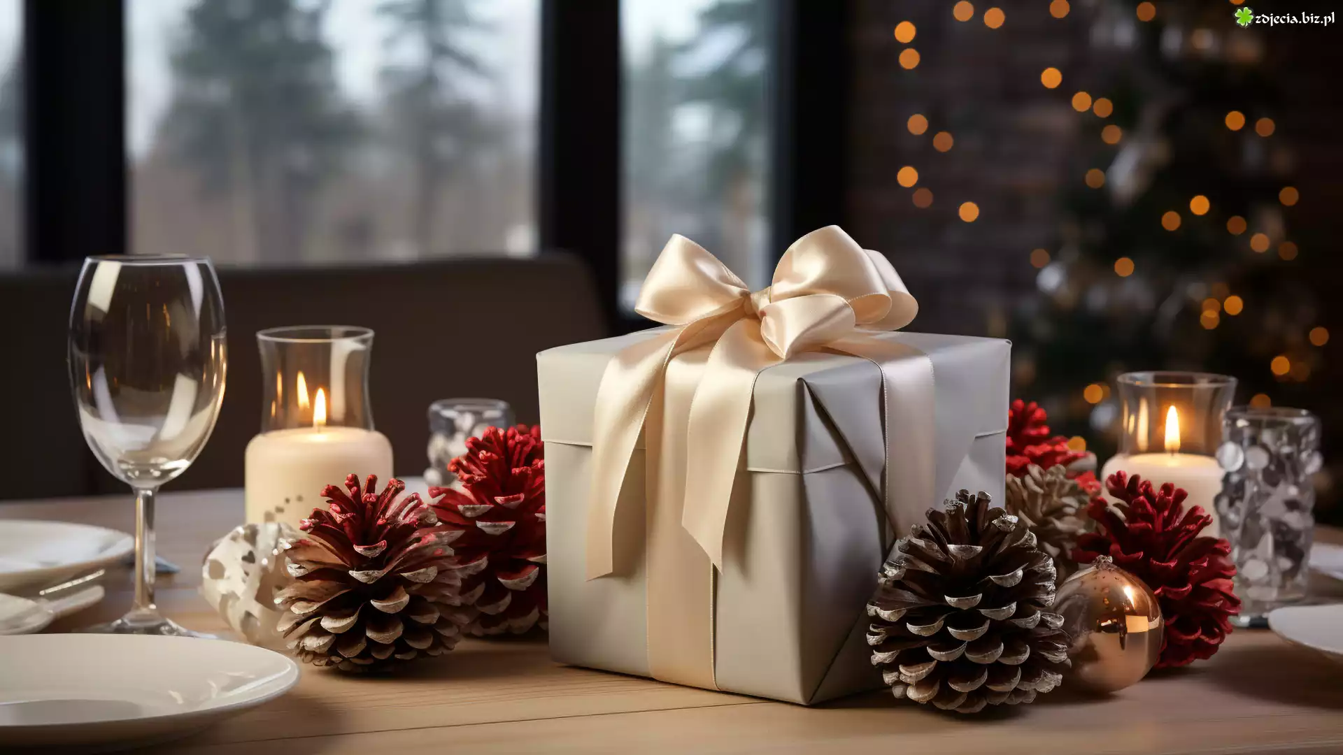 Zdjęcie Dekoracja, Święta, Prezent, Szyszki, Świece, Kieliszek