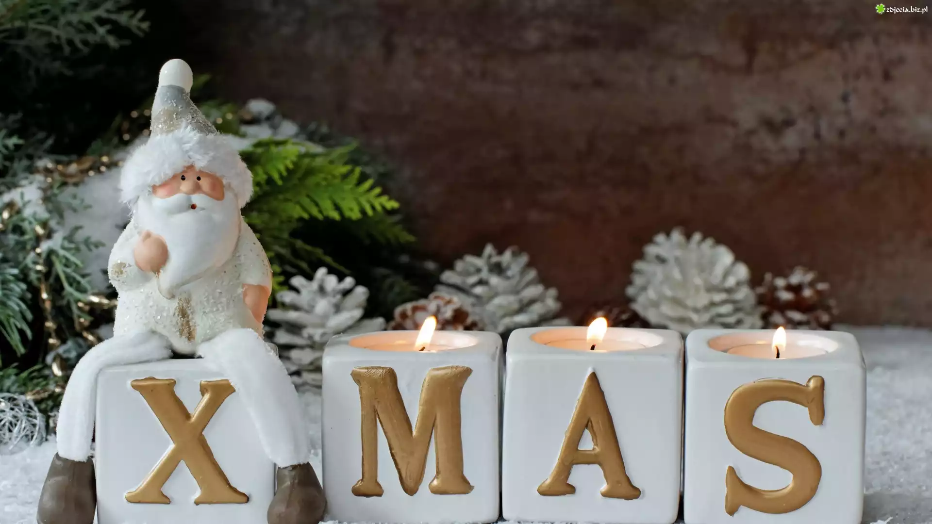 Zdjęcie Dekoracja, Boże Narodzenie, Figurka, Mikołaj, Świeczki, Gałązki, Świerk, Szyszki