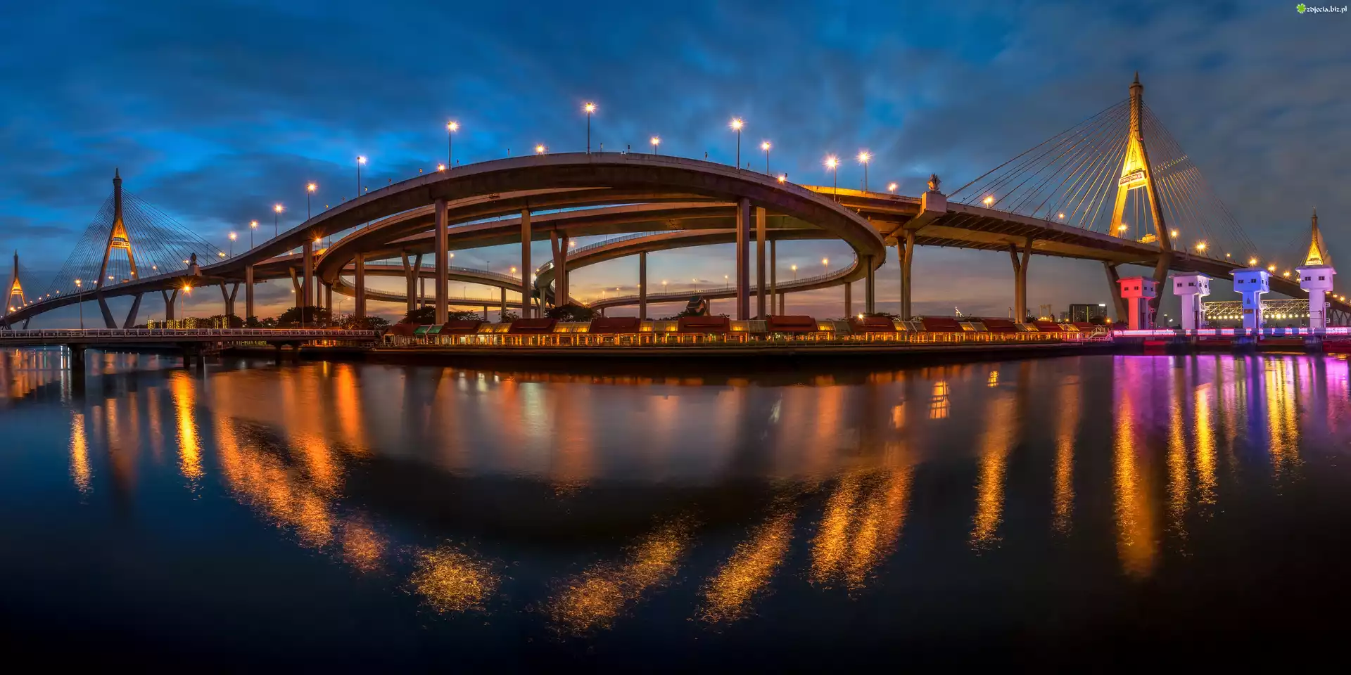 Niebo, Rzeka, Most, Kościół Skały, Morze, Mostek Tajlandia, Bangkok, Miasto, Noc