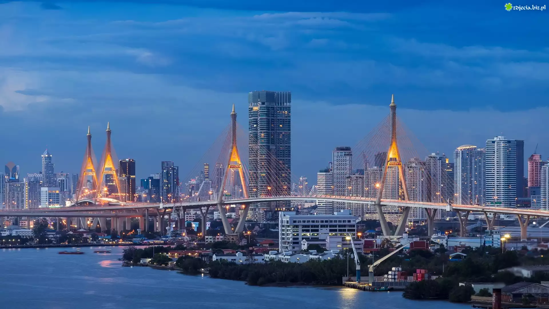 Zdjęcie Tajlandia, Bangkok, Oświetlony, Most, Rzeka, Menam, Wieżowce, Statki, Zmierzch