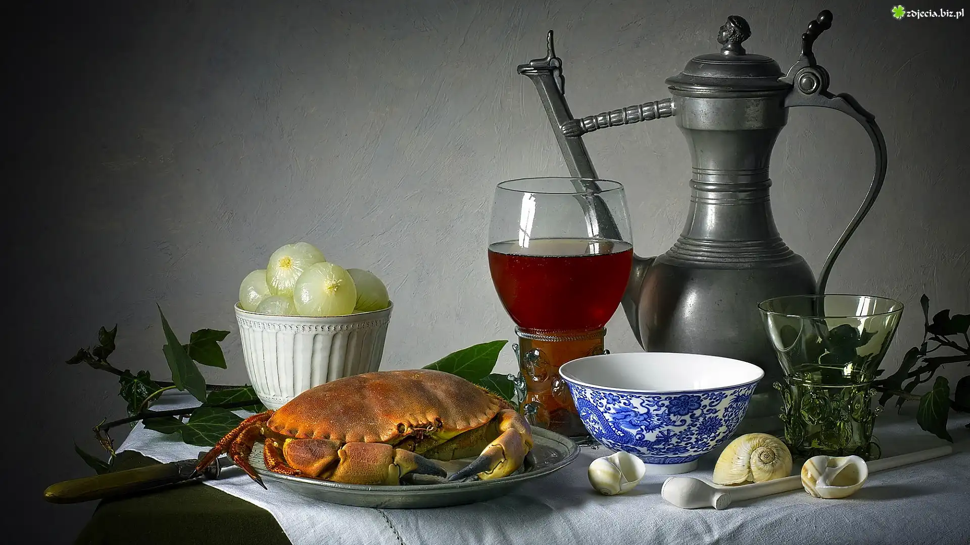 Zdjęcie Krab, Talerz, Cebula, Kubek, Dzbanek, Muszelki, Kompozycja