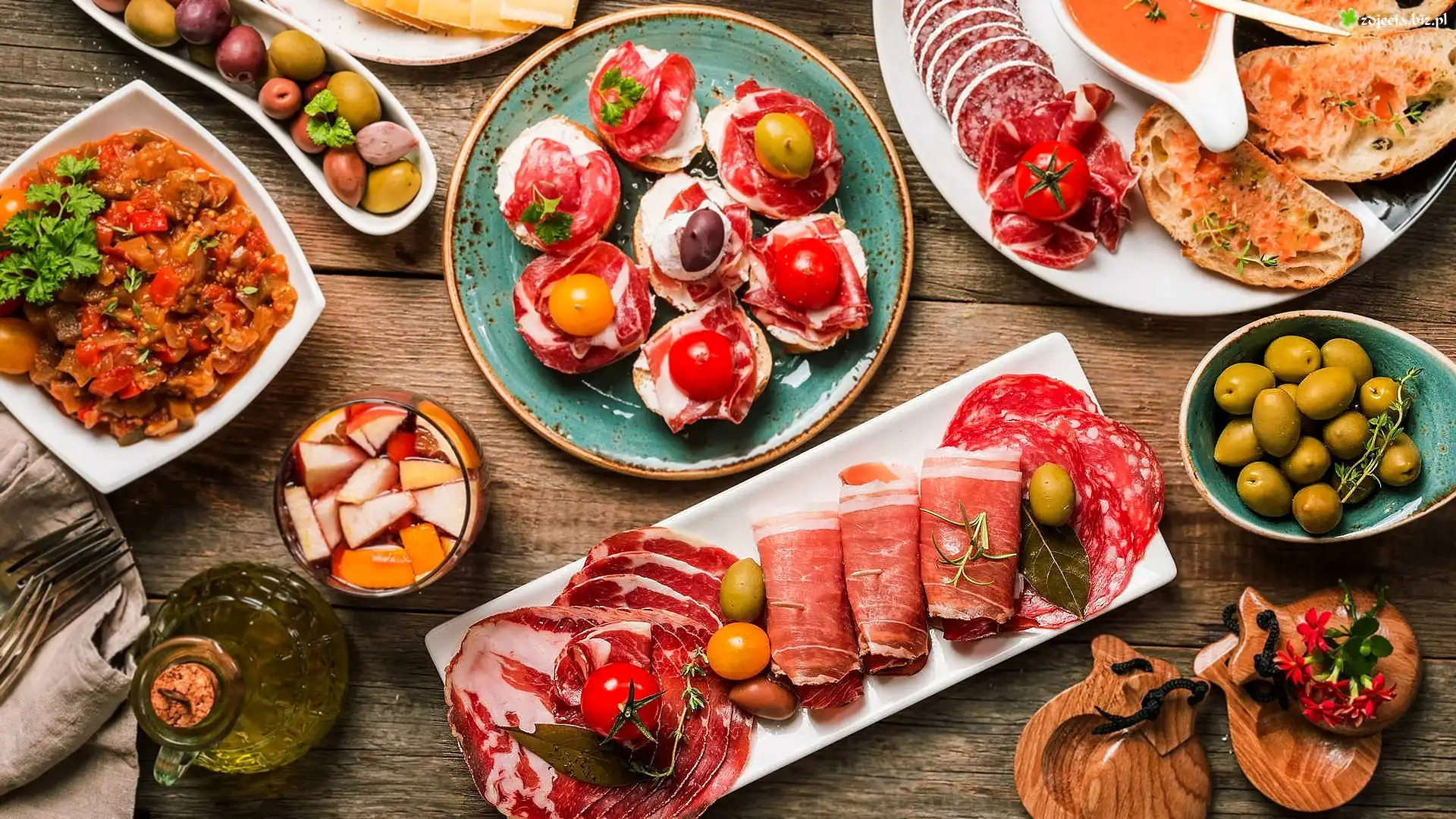 Zdjęcie, Wędliny, Talerz, Oliwa, Bigos, Kompot, Przekąski, Oliwki, Pomidory
