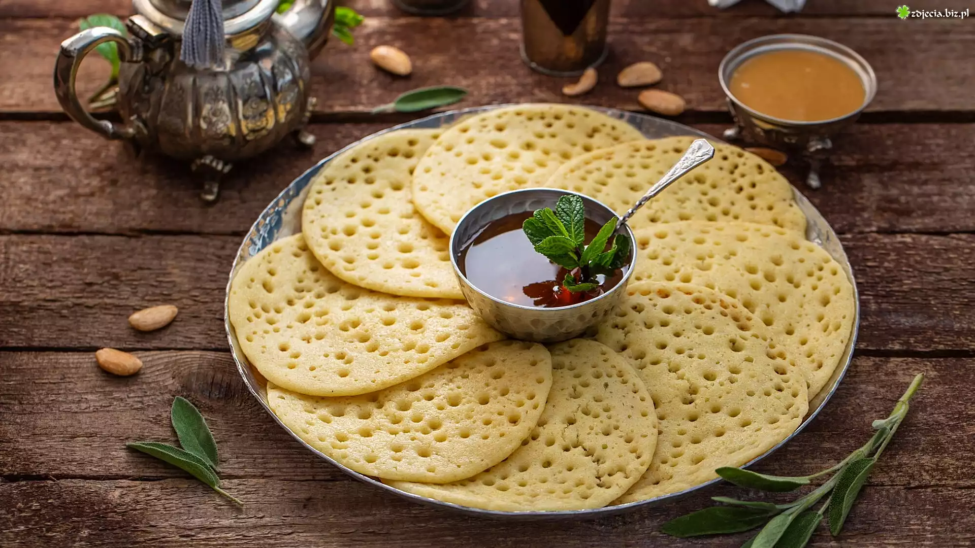 Zdjęcie Talerz, Naleśniki, Miód, Łyżka, Dzbanek