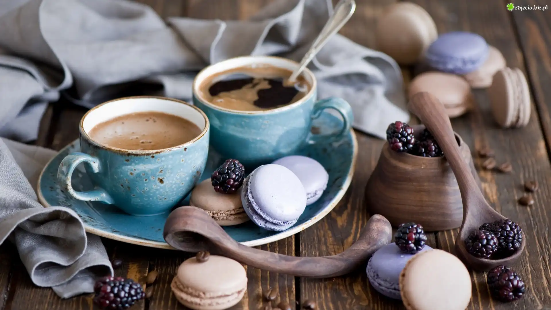Zdjęcie Kompozycja, Kawa, Filiżanki, Jeżyny, Ciasteczka, Makaroniki, Łyżki, Naczynie, Talerzyk