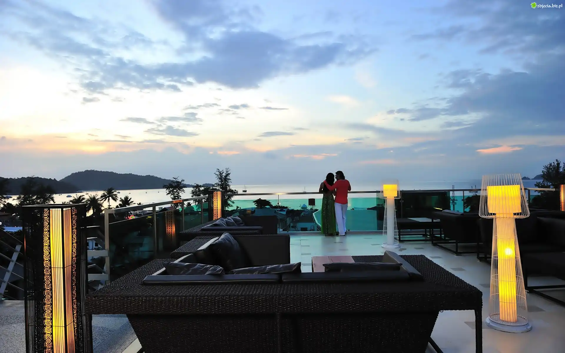 Zdjęcie Hotel, Taras, Widokowy, Góry, Morze, Zakochana, Para