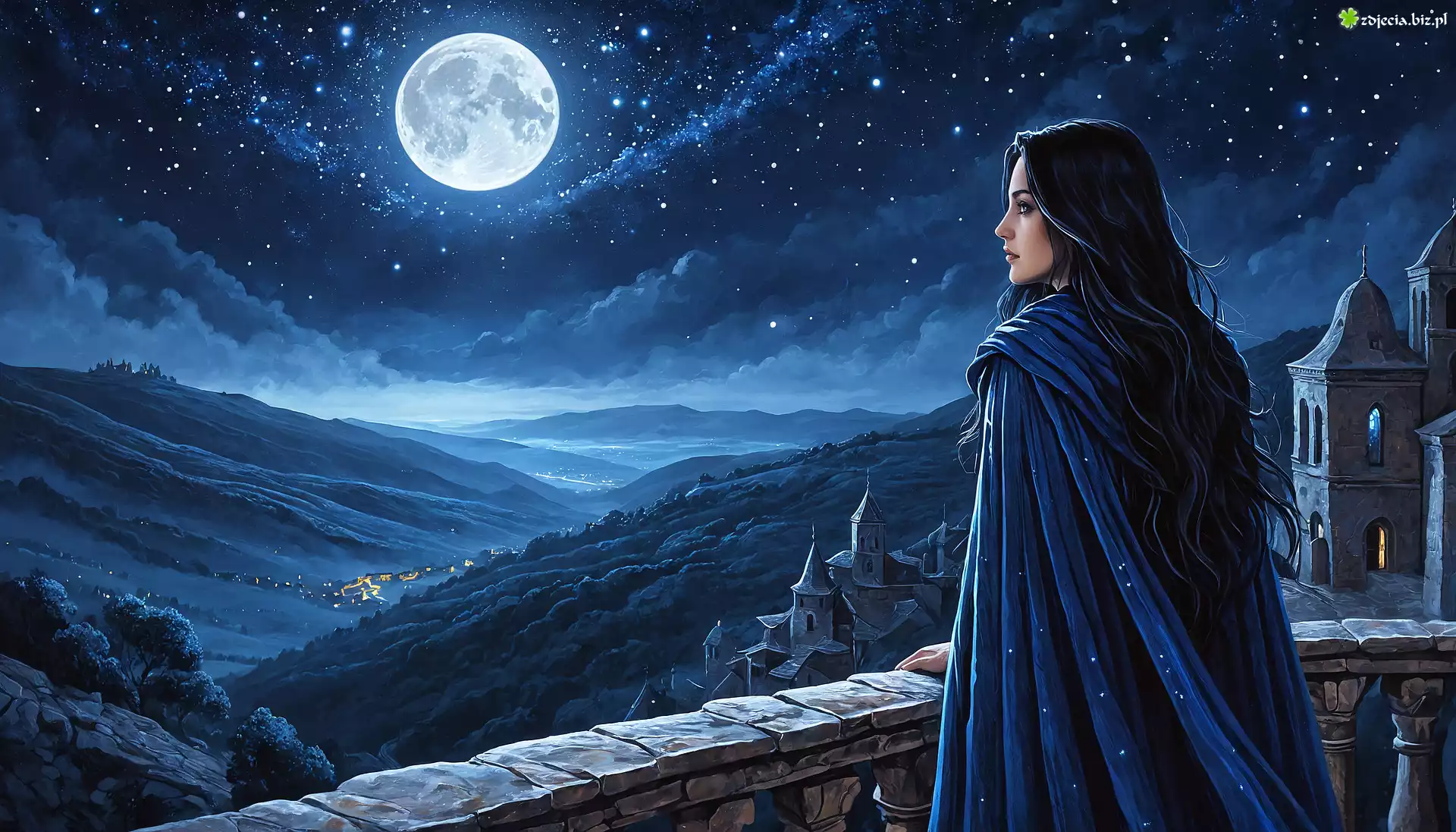Zdjęcie Kobieta, Noc, Zamek, Taras, Księżyc, Niebo, Grafika