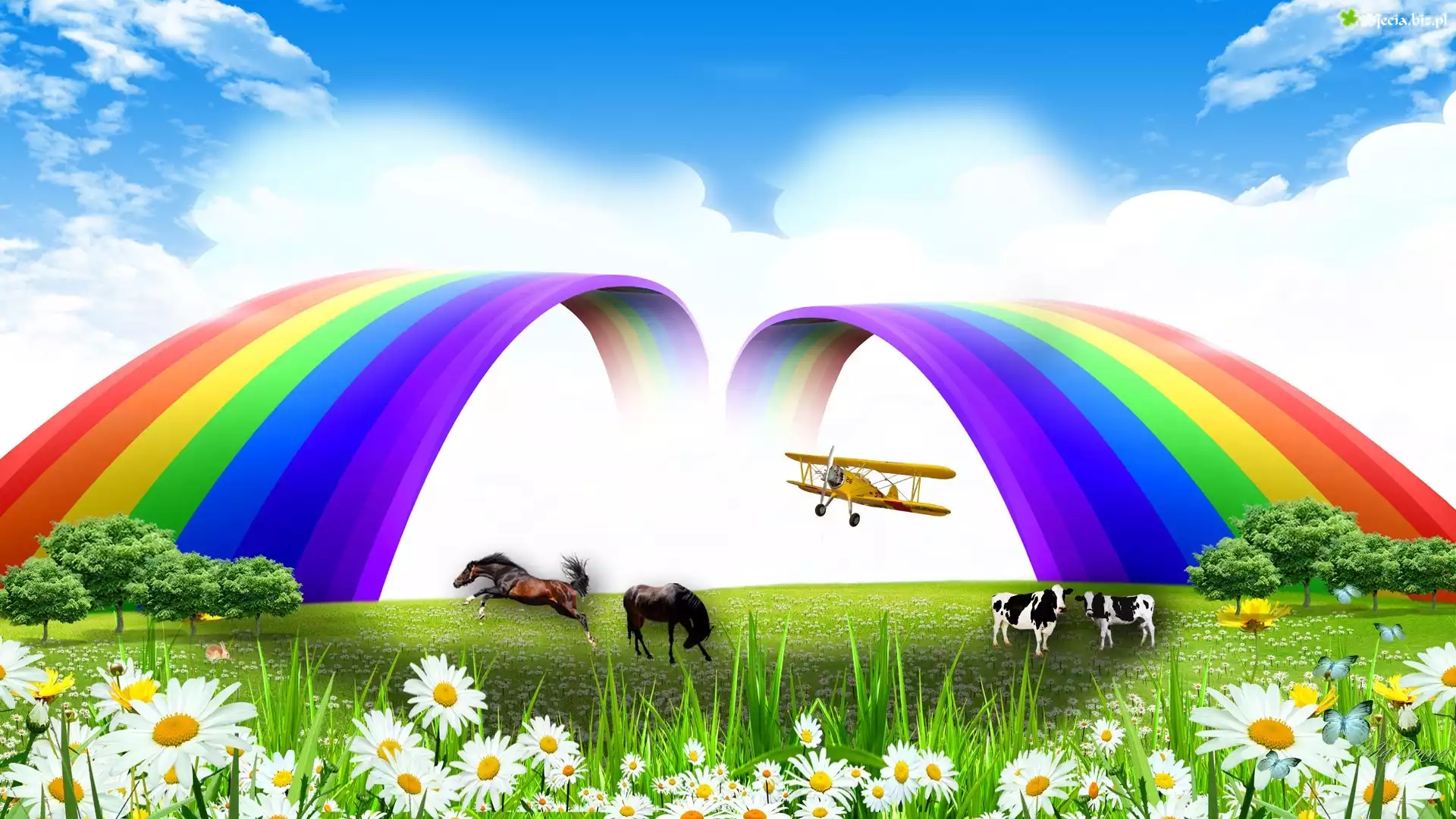Zdjęcie Niebo, Tęcze, Samolot, Drzewa, Zwierzęta, Łąka, Trawa, Kwiaty