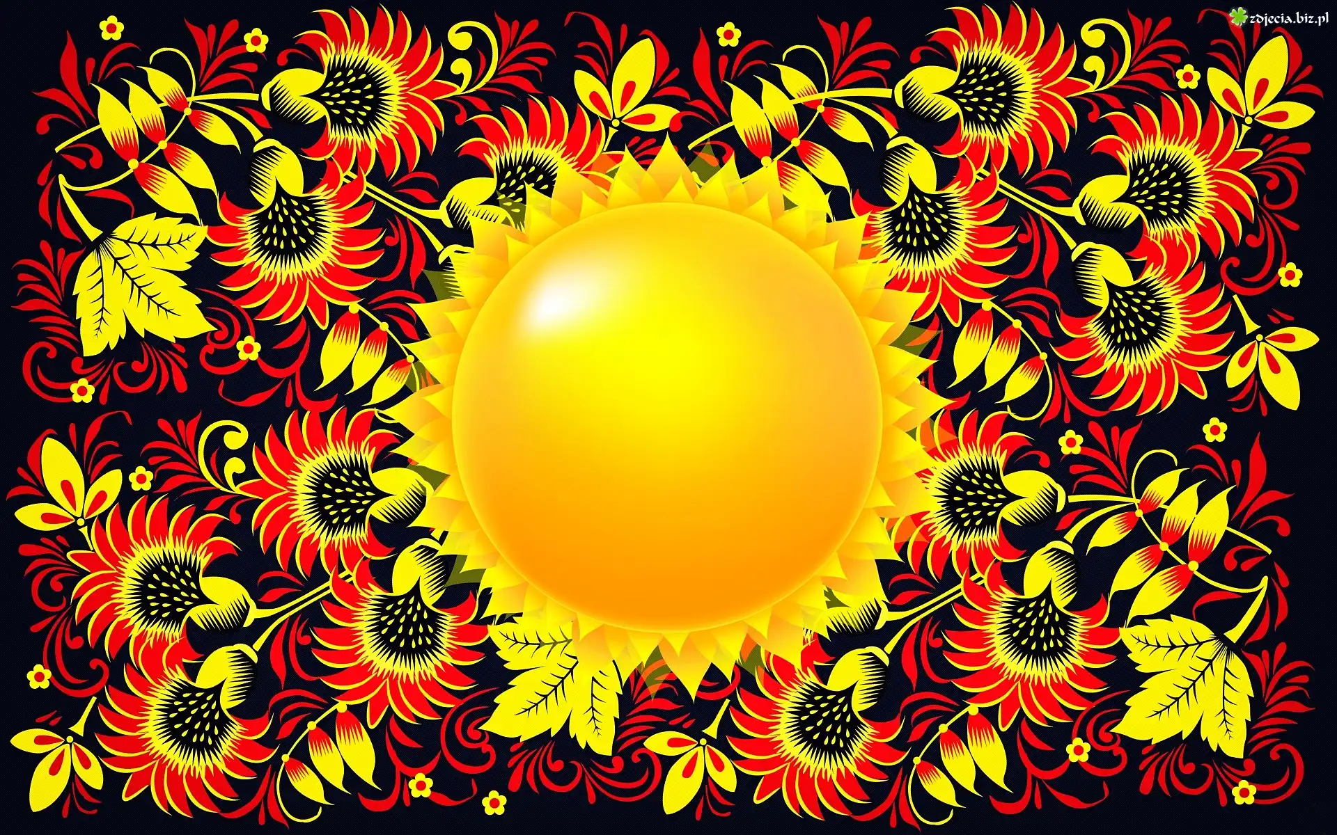 Zdjęcie Tekstura, Słońce, Kwiaty, Ciemne tło, Khokhloma