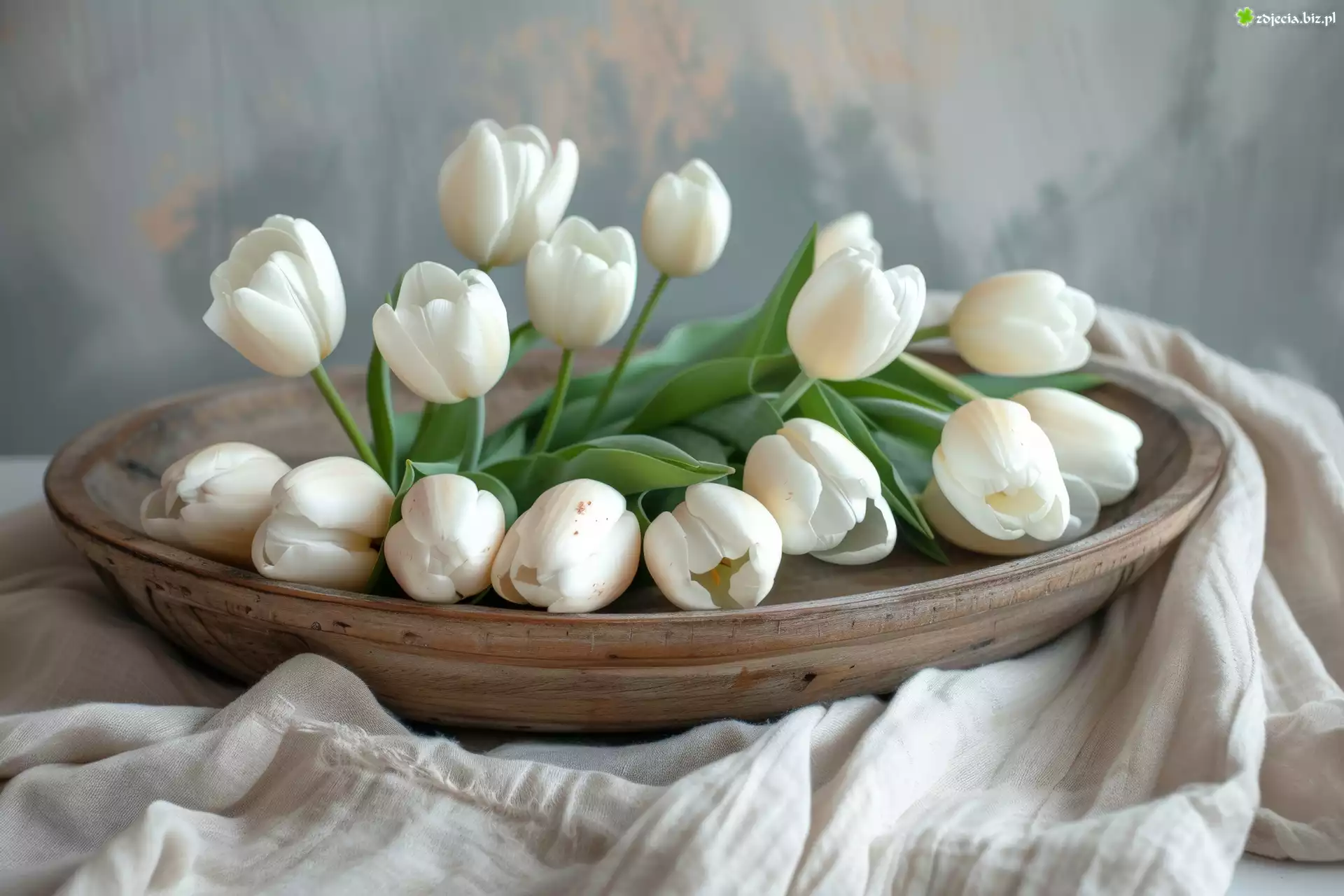 Zdjęcie Białe, Tulipany, Talerz, Tkanina