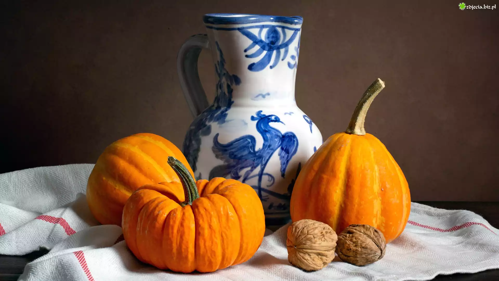 Zdjęcie Dynie, Orzechy, Dzbanek, Tkanina
