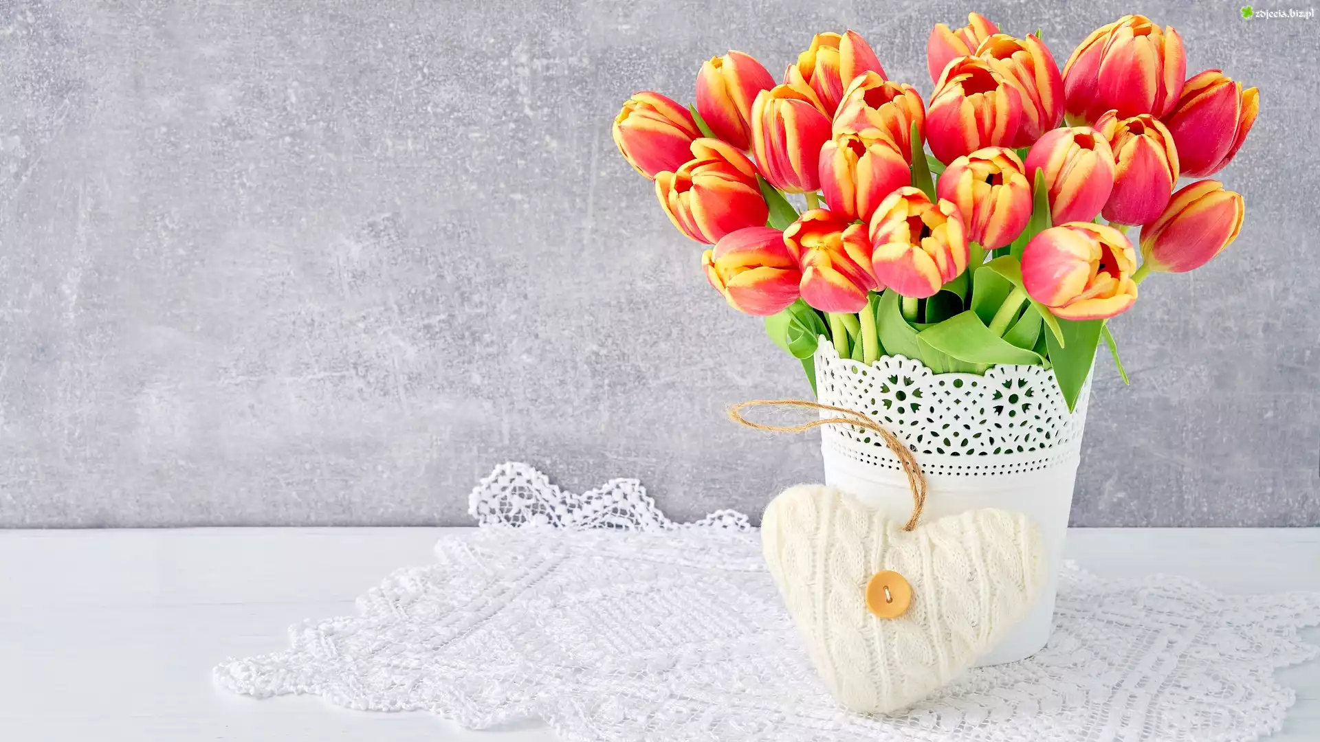 Zdjęcie, Czerwono-żółte, Tulipany, Doniczka, Dzianinowe, Serce, Zawieszka, Serwetka, Szare tło