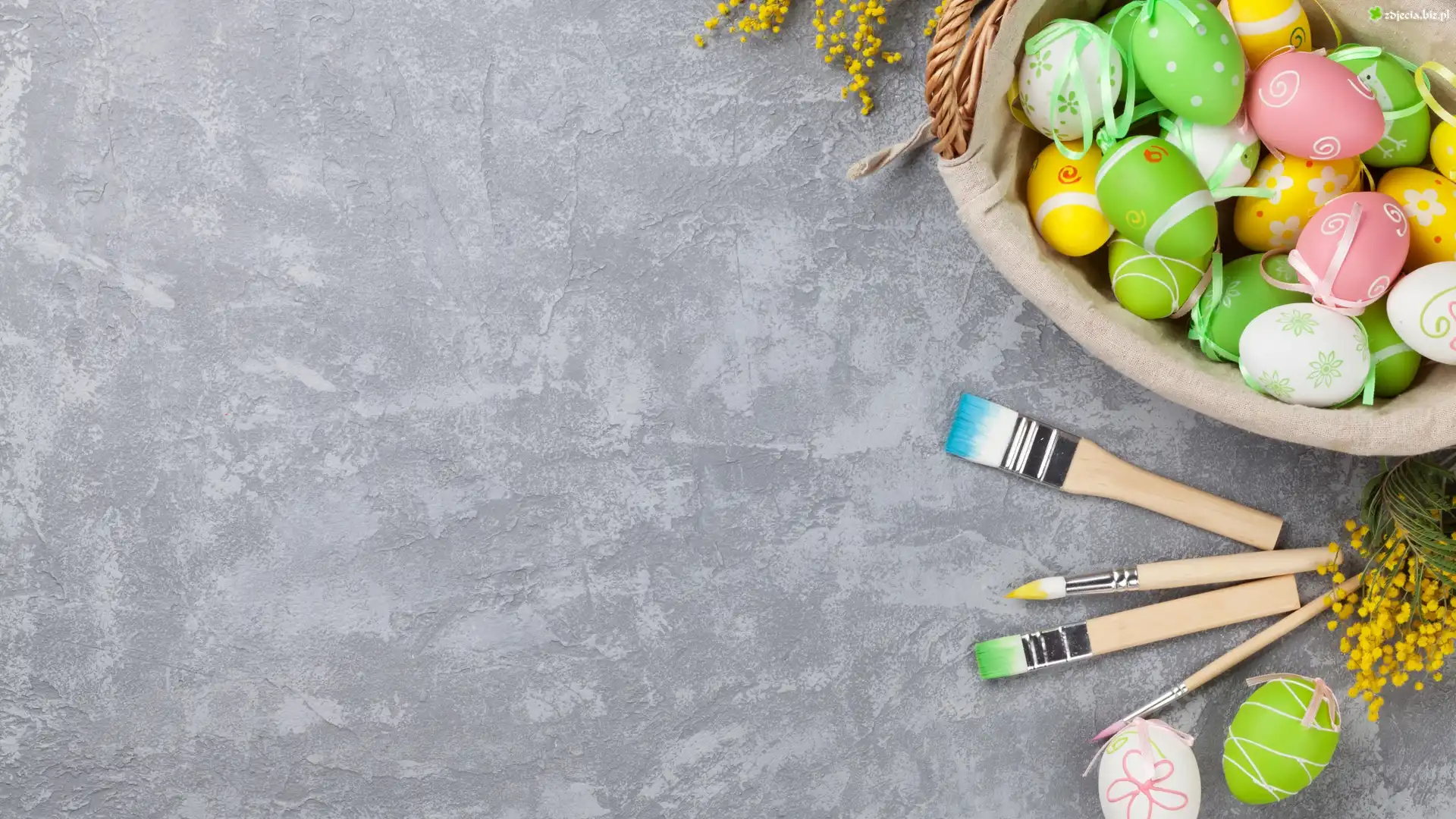 Zdjęcie Wielkanoc, Koszyk, Kolorowe, Pisanki, Pędzle, Żółte, Kwiatki, Szare, Tło