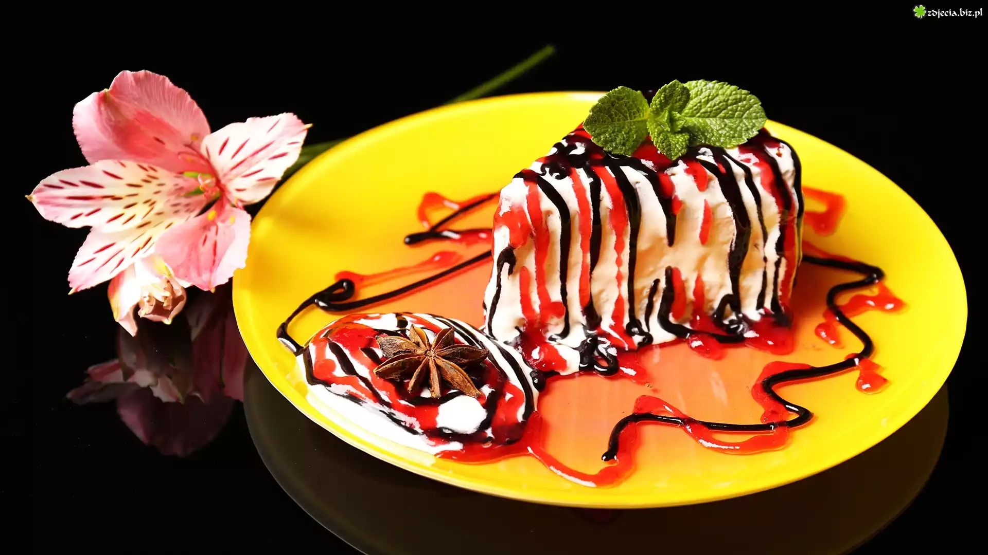 Zdjęcie, Lody, Sos, Anyż gwiaździsty, Żółty, Talerz, Kwiat, Alstremeria, Czarne, Tło