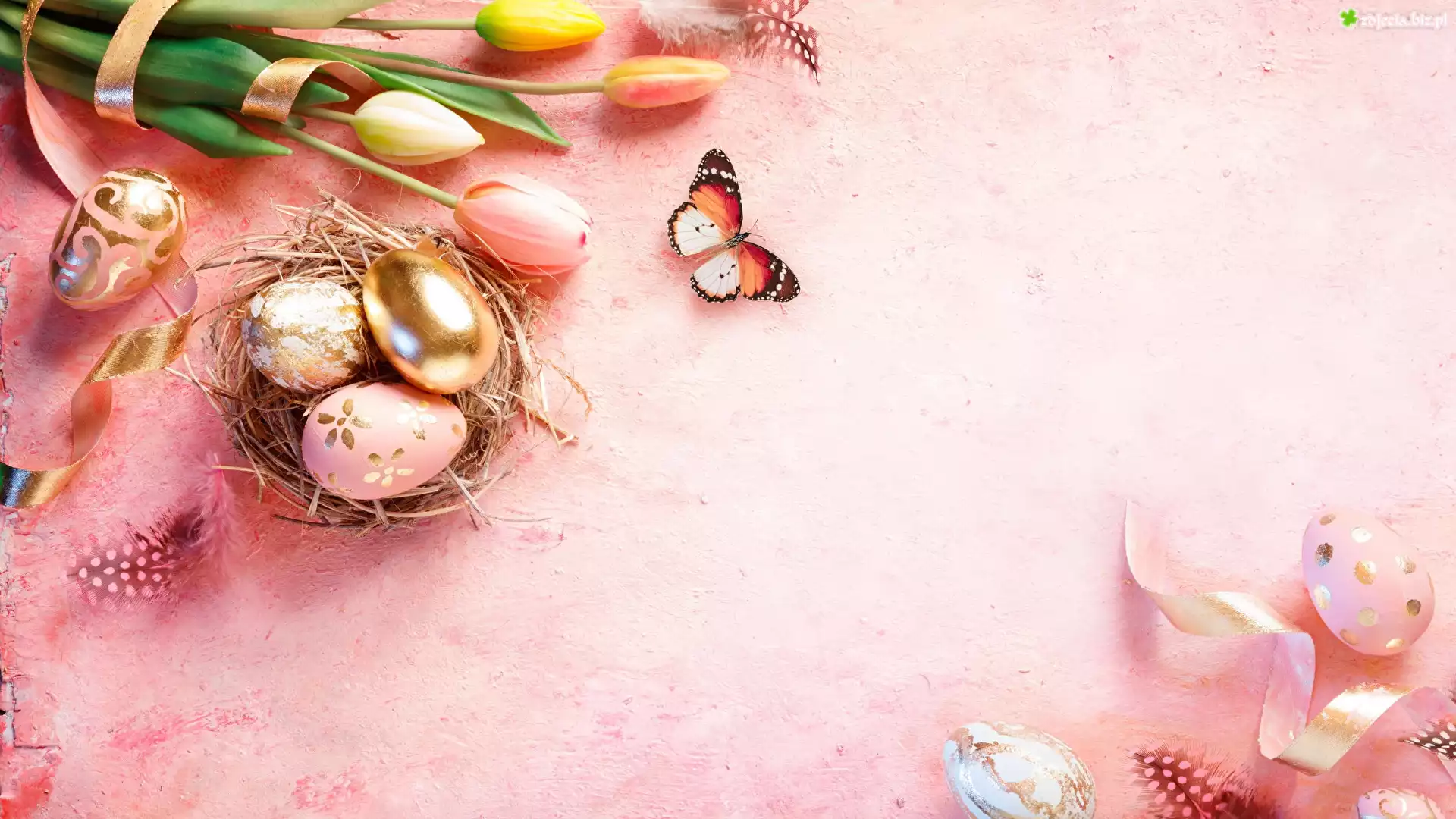 Zdjęcie Wielkanoc, Kwiaty, Tulipany, Gniazdo, Pisanki, Motyle, Różowe tło