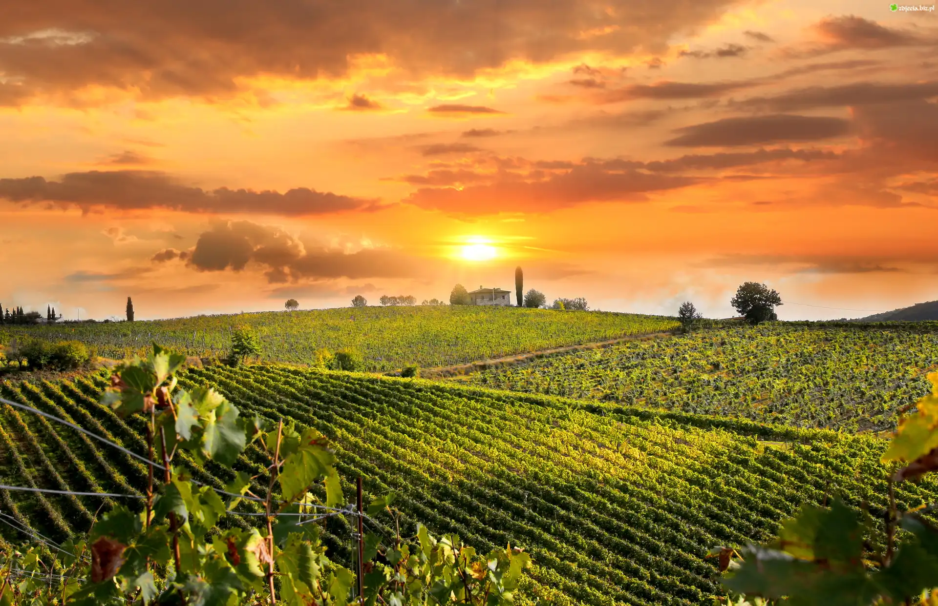 Zdjęcie, Włochy, Toskania, Pole, Plantacja, Zachód słońca, Dom, Drzewa