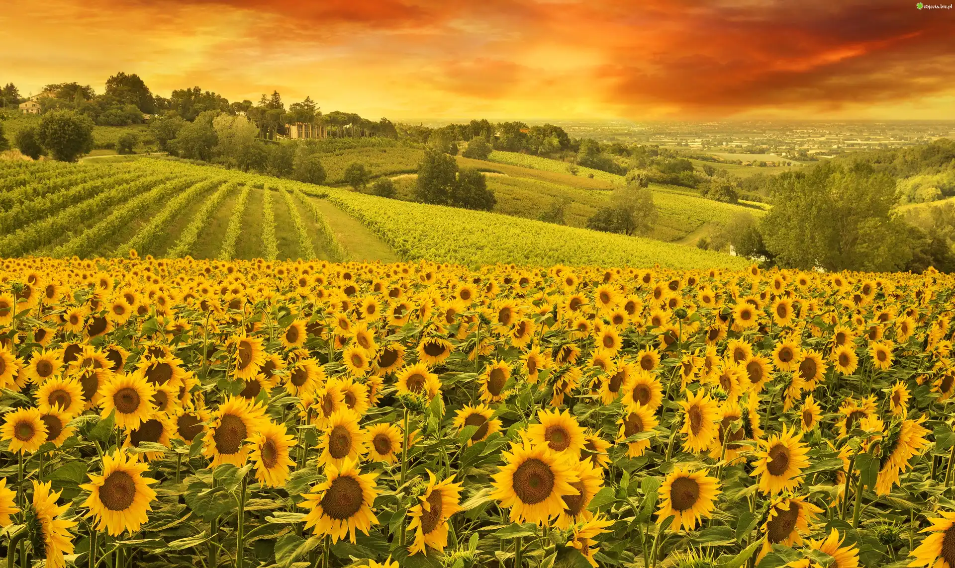 Zdjęcie, Włochy, Toskania, Wzgórza, Plantacja, Słoneczniki, Drzewa, Zachód słońca