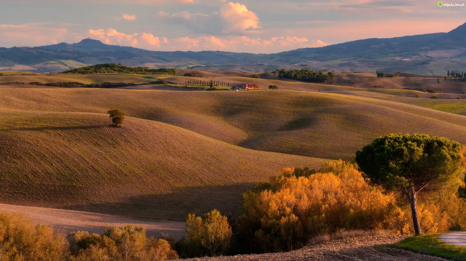 Zdjęcie, Włochy, Toskania, Pola, Wzgórza, Drzewa, Domy, Chmury