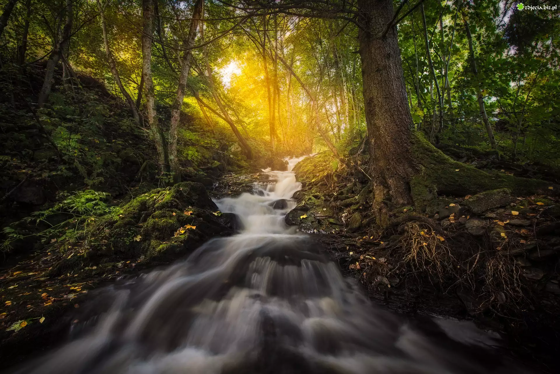 Zdjęcie, Norwegia, Region Trøndelag, Las, Przebijające światło, Drzewa, Rzeczka, Strumień