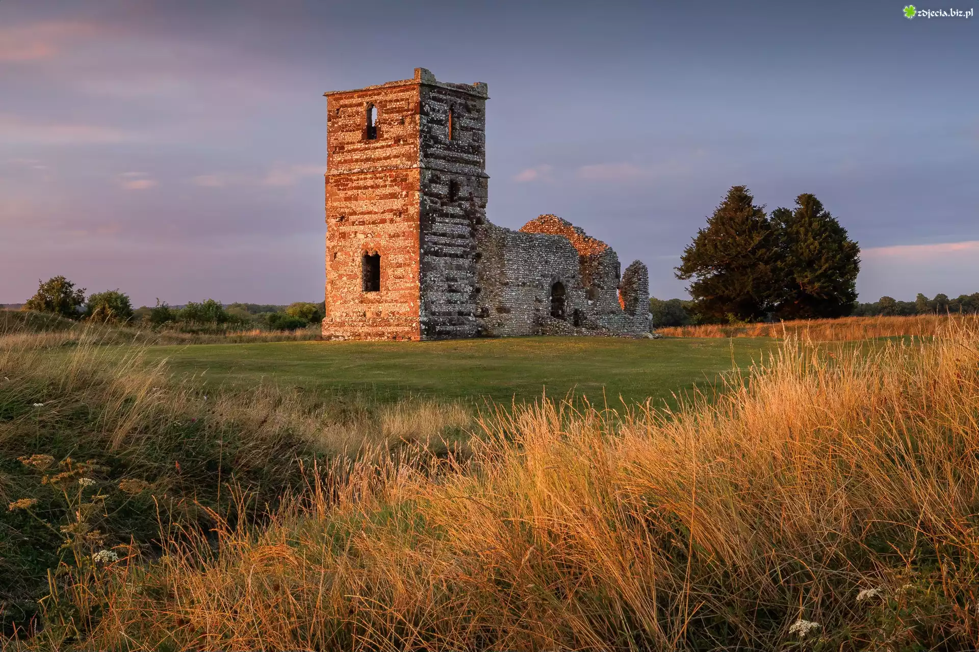 Zdjęcie Wielka Brytania, Anglia, Wimborne, Kościół, Knowlton Church, Ruiny, Drzewa, Trawa, Zachód Słońca |