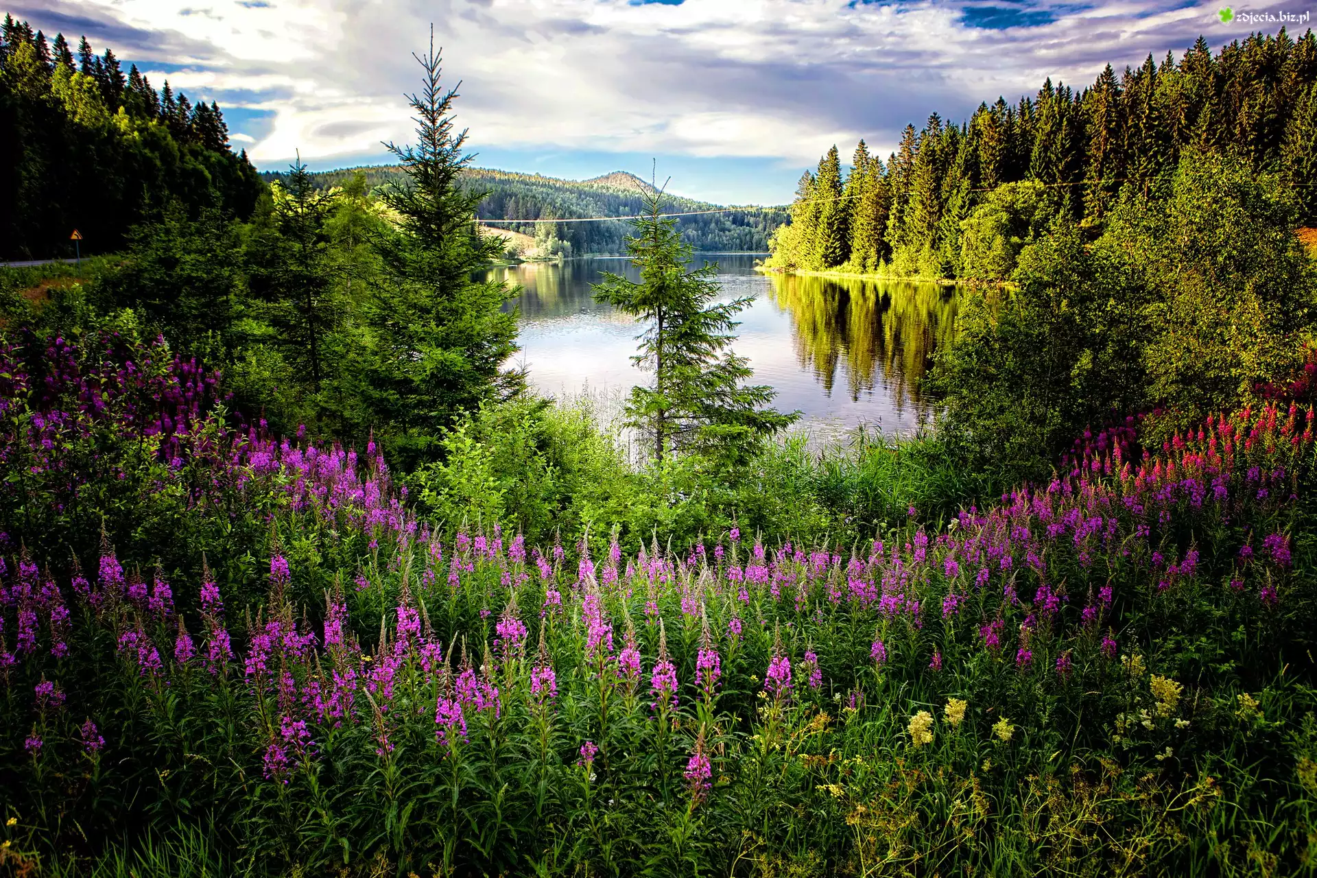 Zdjęcie Kwiaty, Trawa, Rośliny, Drzewa, Jezioro, Wzgórza, Niebo, Chmury