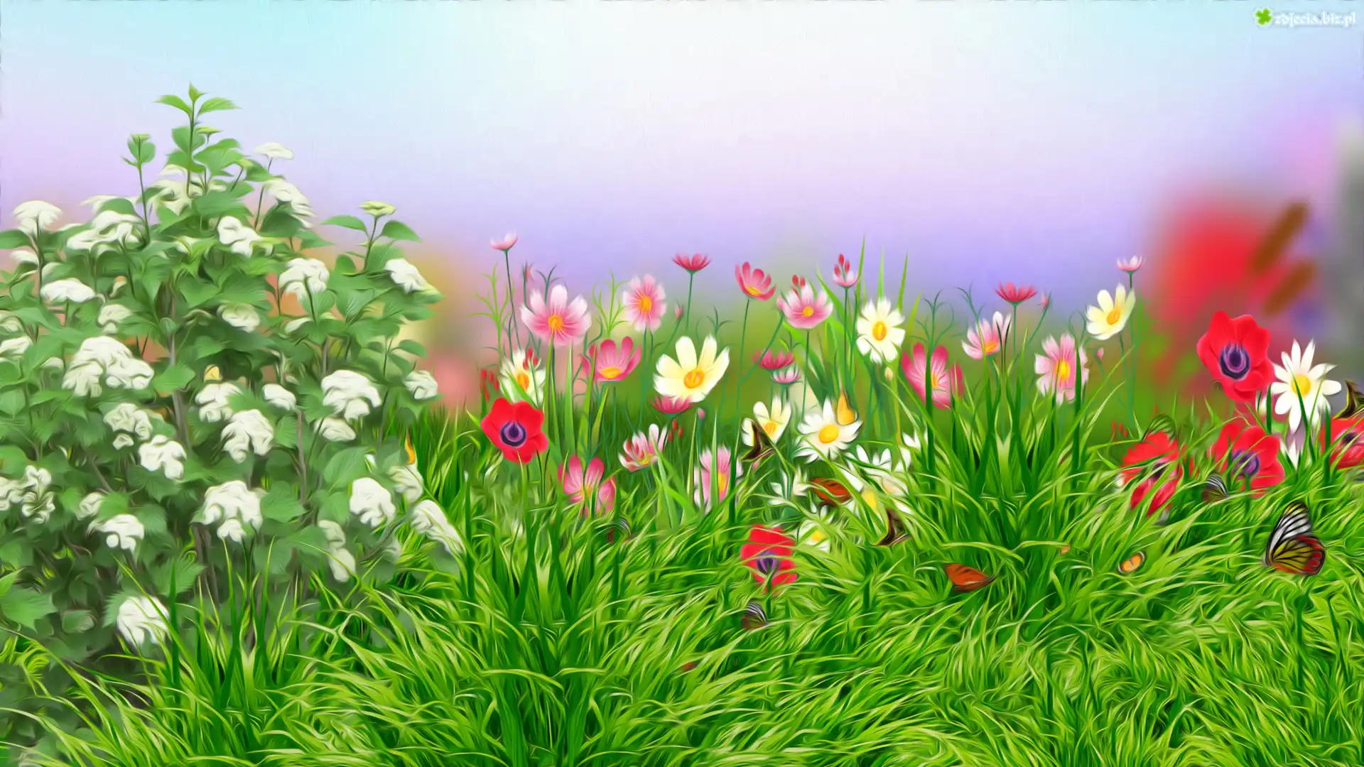 Zdjęcie Trawa, Kwiaty, Krzew, Farba olejna