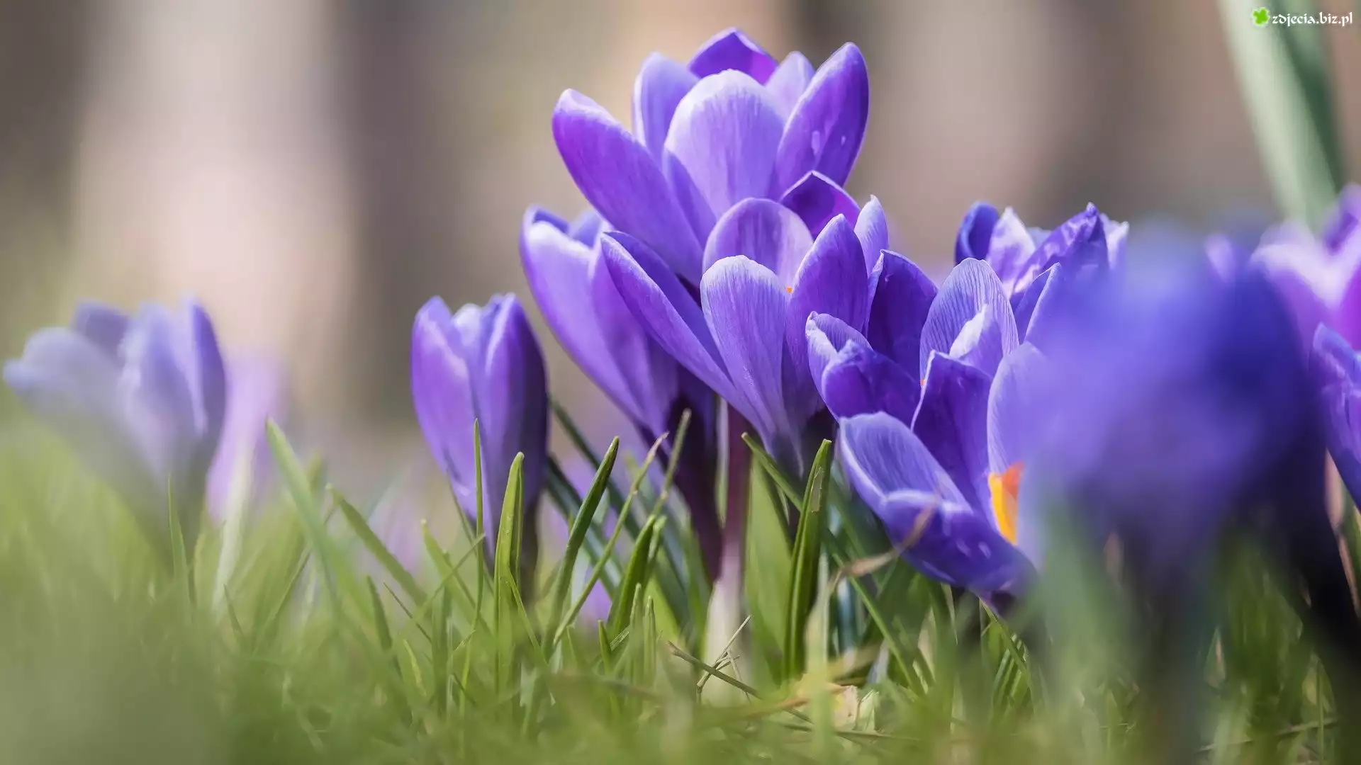 Zdjęcie Fioletowe, Kwiaty, Krokusy, Trawa