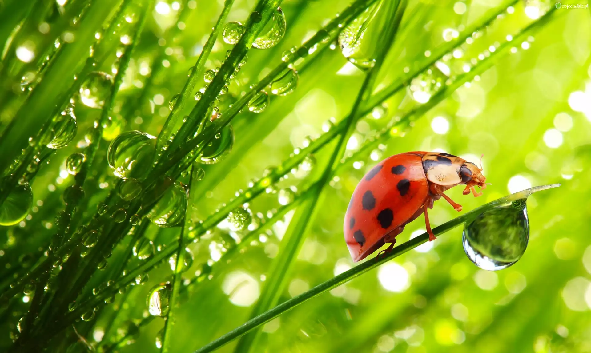 Zdjęcie Trawa, Woda, Krople, Biedronka